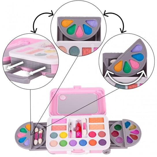 Фантастический набор косметики, сложенный в чемодан, содержит множество косметических средств, которые обязательно понравится каждой девушке. Вы найдете множество теней для век и ярких блесков для губ, которые позволят вам воссоздать различные стили.