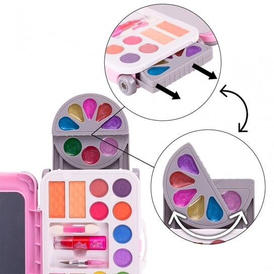 Весь набор поместился в розовый пластиковый мини-чемодан на колесиках. Чемодан оснащен удобной выдвижной ручкой и колесиками, поэтому ребенок сможет брать его с собой куда угодно.