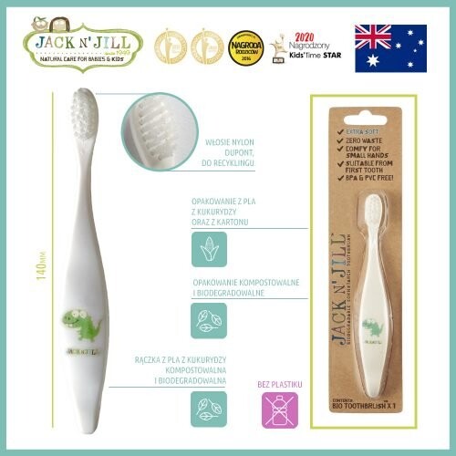 Зубная щетка Jack N «Джилл» сделана из биоразлагаемого материала: кукурузных волокон. Зубная щетка ломается примерно через 90 дней, ее структура более удобна для детей благодаря мягкости.