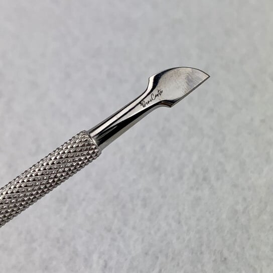 Два конца точной формы: вогнутая долото для проталкивания кутикулы внутрь и острая полукруглая долото для бокового удаления кутикулы с ногтей.