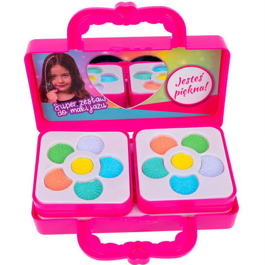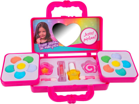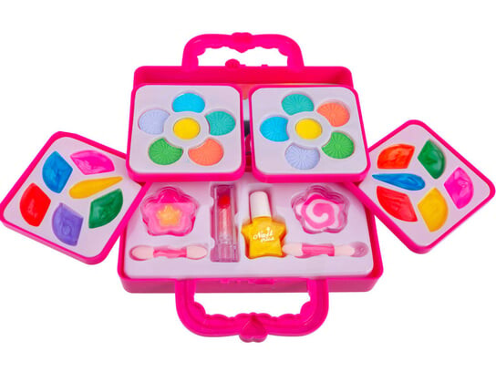 Вся вещь закрывается в чемоданчик, поэтому ее легко можно взять с собой. Игра с макияжем стимулирует творческие способности и воображение девушки.