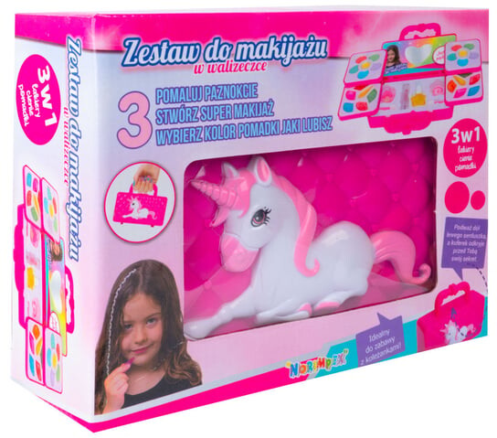 Он содержит множество аксессуаров, которые позволяют воссоздавать различные стили. Косметика помещена в интересную коробочку в виде чемоданчика с единорогом.