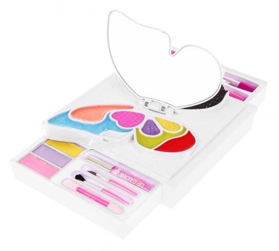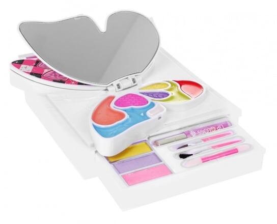 Содержит все необходимое для макияжа: целую палитру ярких теней, блесков для губ, помад.