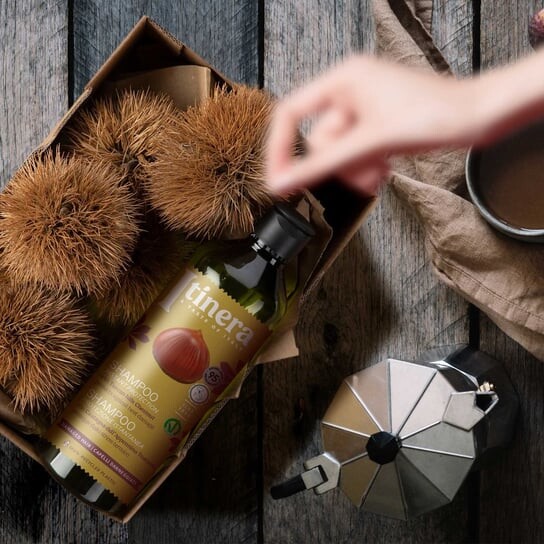 В этот набор добавлены органические каштаны, богатые жирными кислотами и витаминами, которые помогают питать волосы и придавать им блеск.