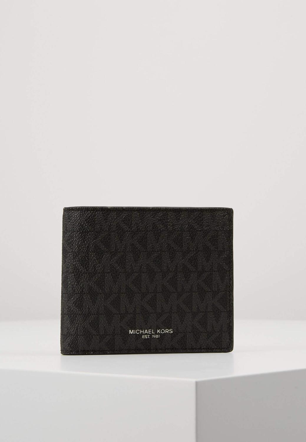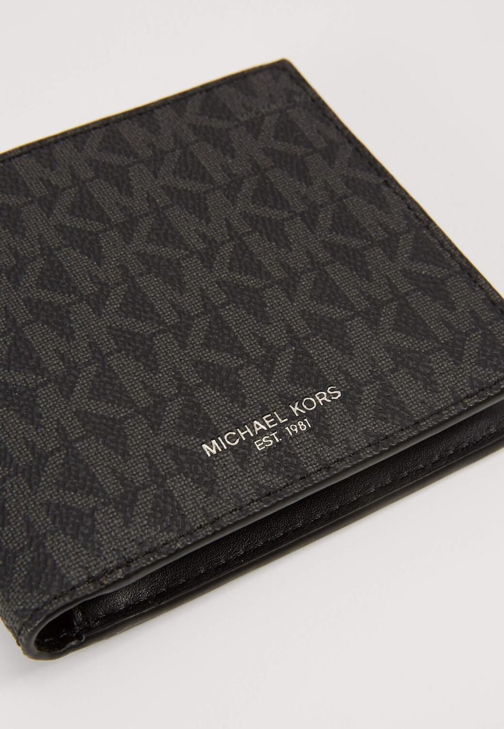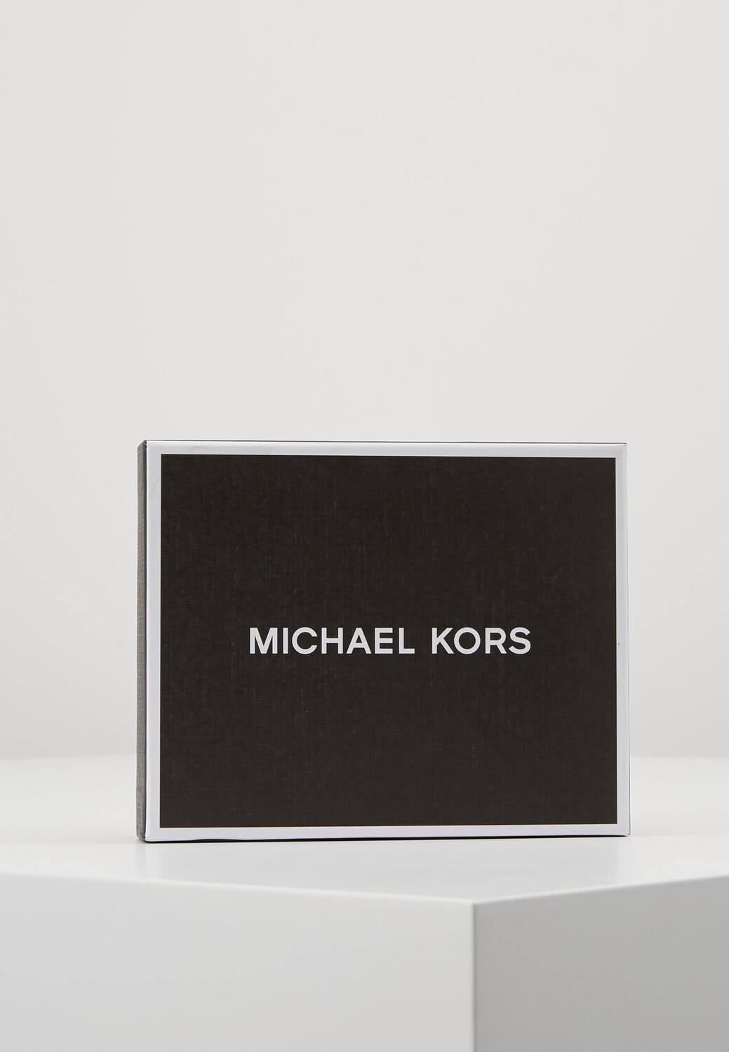 Складная визитница изготовлена из практичного материала с фирменным принтом Michael Kors. Аксессуар со слотами для банковских карт, без застежки.