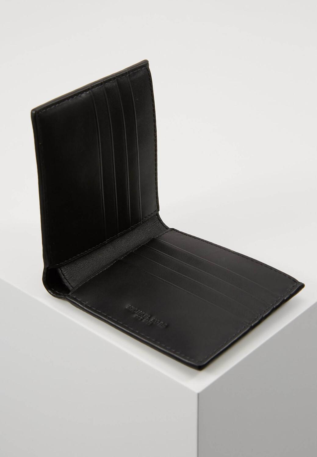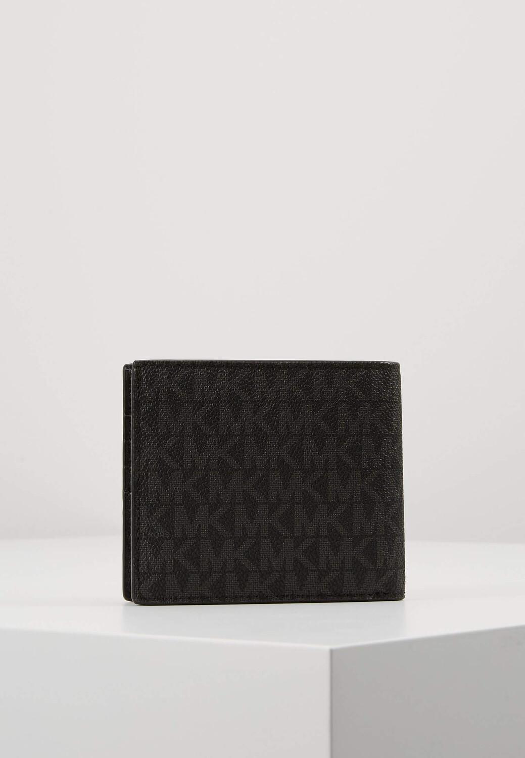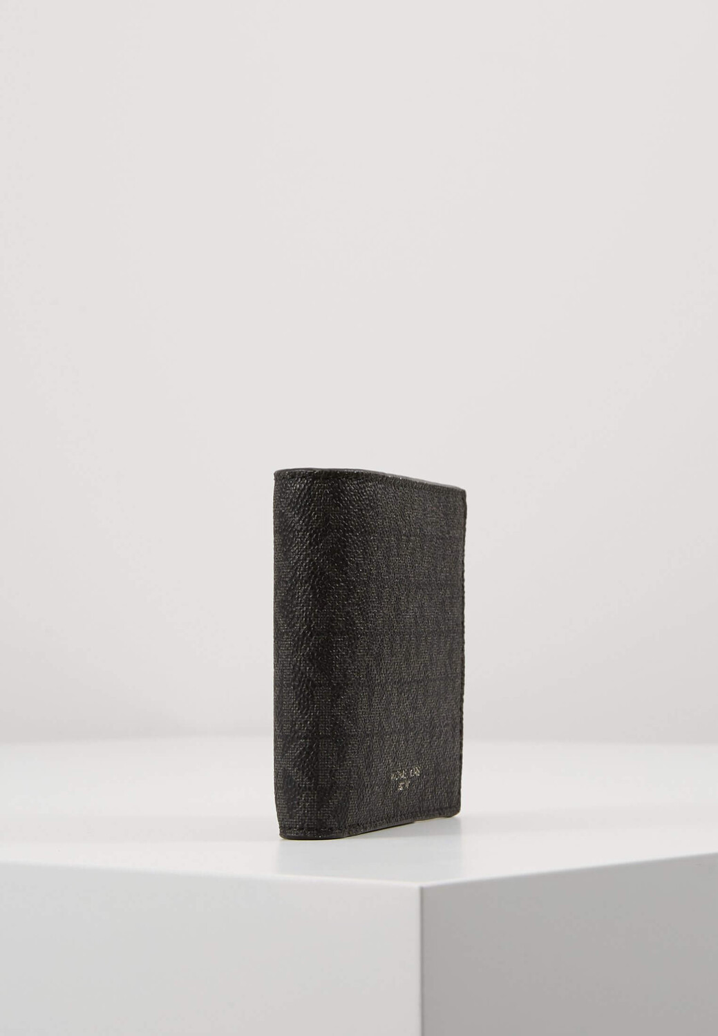 Складная визитница изготовлена из практичного материала с фирменным принтом Michael Kors. Аксессуар со слотами для банковских карт, без застежки.