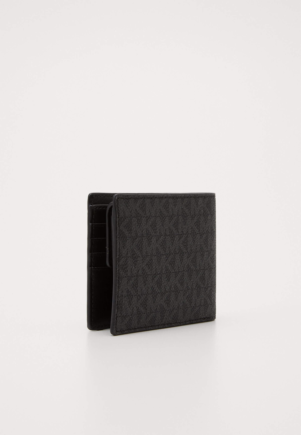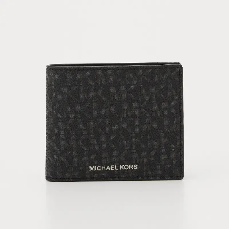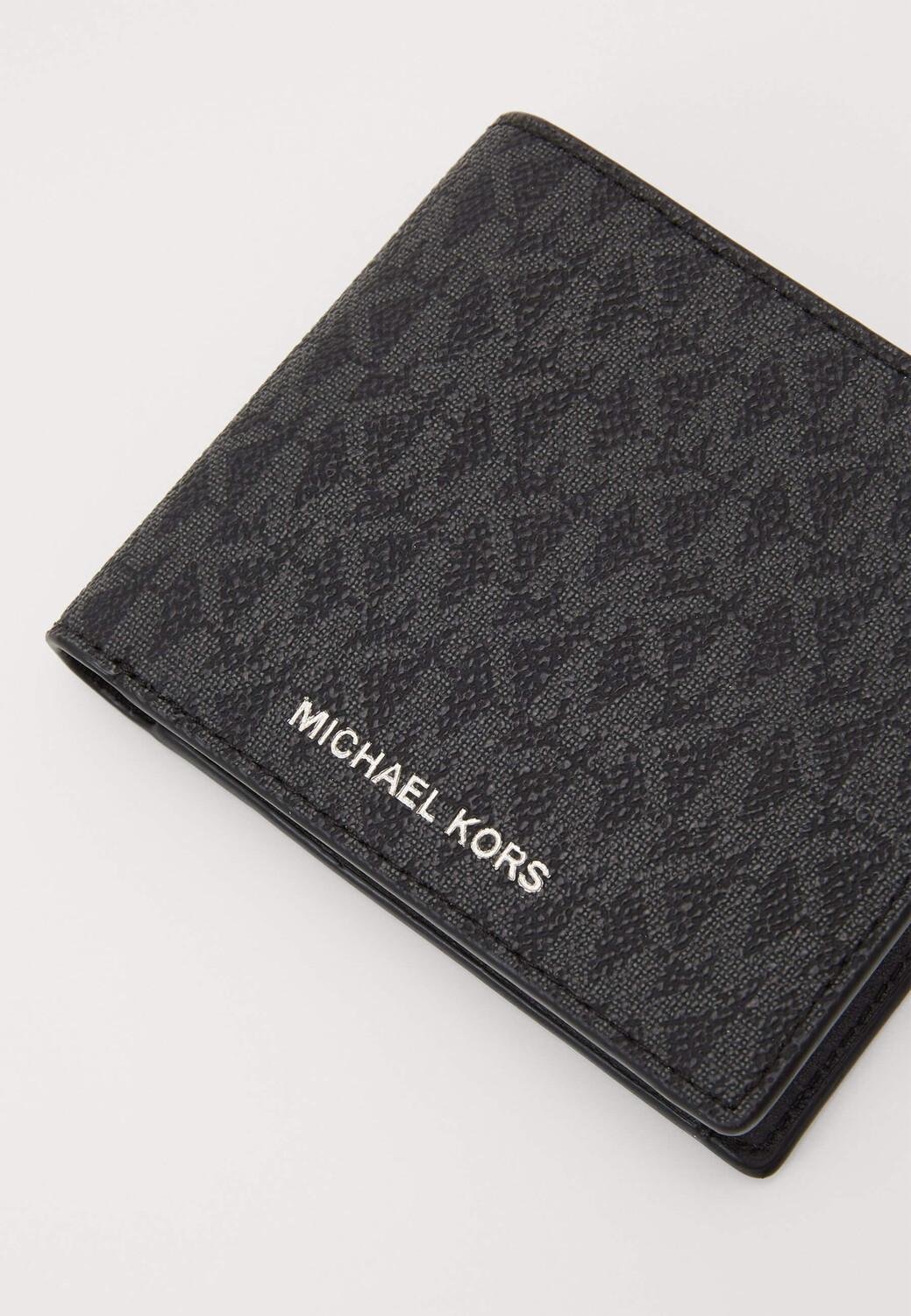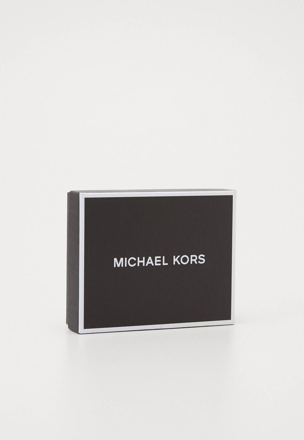 Складной кошелек без застежки изготовлен из практичного материала с фирменным принтом Michael Kors. Аксессуар со слотами для банковских карт дополнены карманами для купюр. Модель с карманом для монет на кнопке.