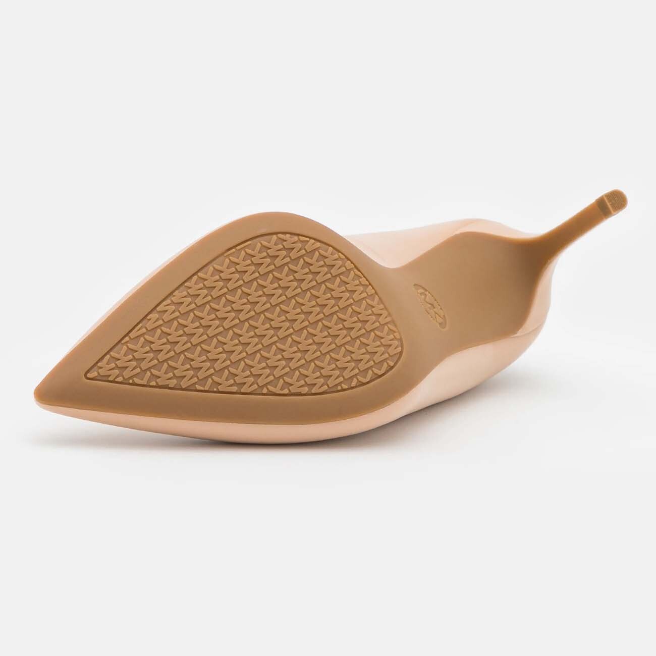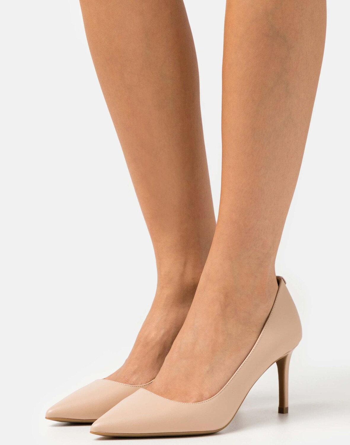 Туфли на среднем каблуке Alina Flex Kitten от MICHAEL Michael Kors бежевого цвета. Модель из кожи, имеет остроконечный носок и украшена фирменным логотипом MK золотистого цвета.