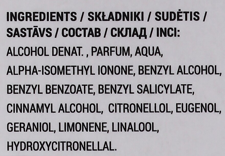 Верхние ноты: Бергамот, Цитрусовые, Мускатный орех, Кориандр, Перец< Сердце ноты: персик, фиалка, ирис, жасмин, ландыш, мимоза, роза