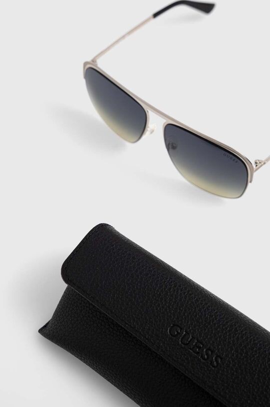 Солнцезащитные очки из коллекции Guess. Модель с затемненными линзами и оправой из комбинации металла и пластика. Имеет фильтр UV 400.