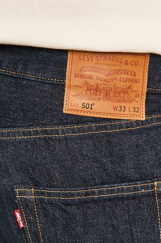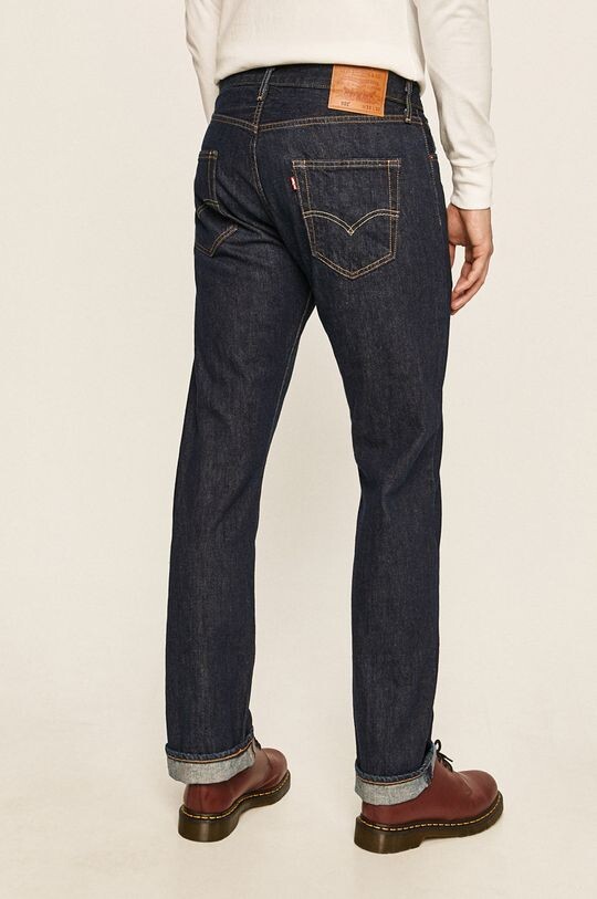 Джинсы из коллекции Levi's. Классический фасон брюк с прямыми штанинами. Модель выполнена из темного денима с контрастной строчкой. Застегивается на пуговицы.