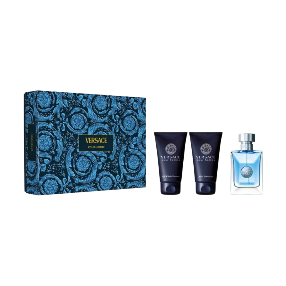 Комплект для мужчин от Versace, в состав которого входят: туалетная вода Versace Pour Homme 50 мл, а также гель для душа и бальзам после бритья объёмами 50 мл. Идеальная идея для подарка.