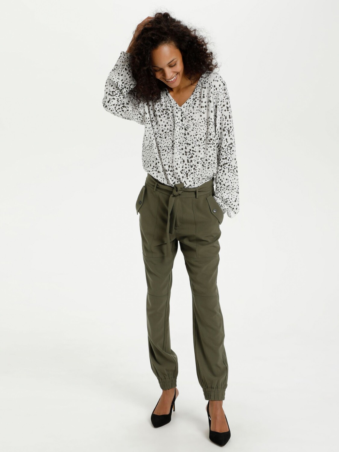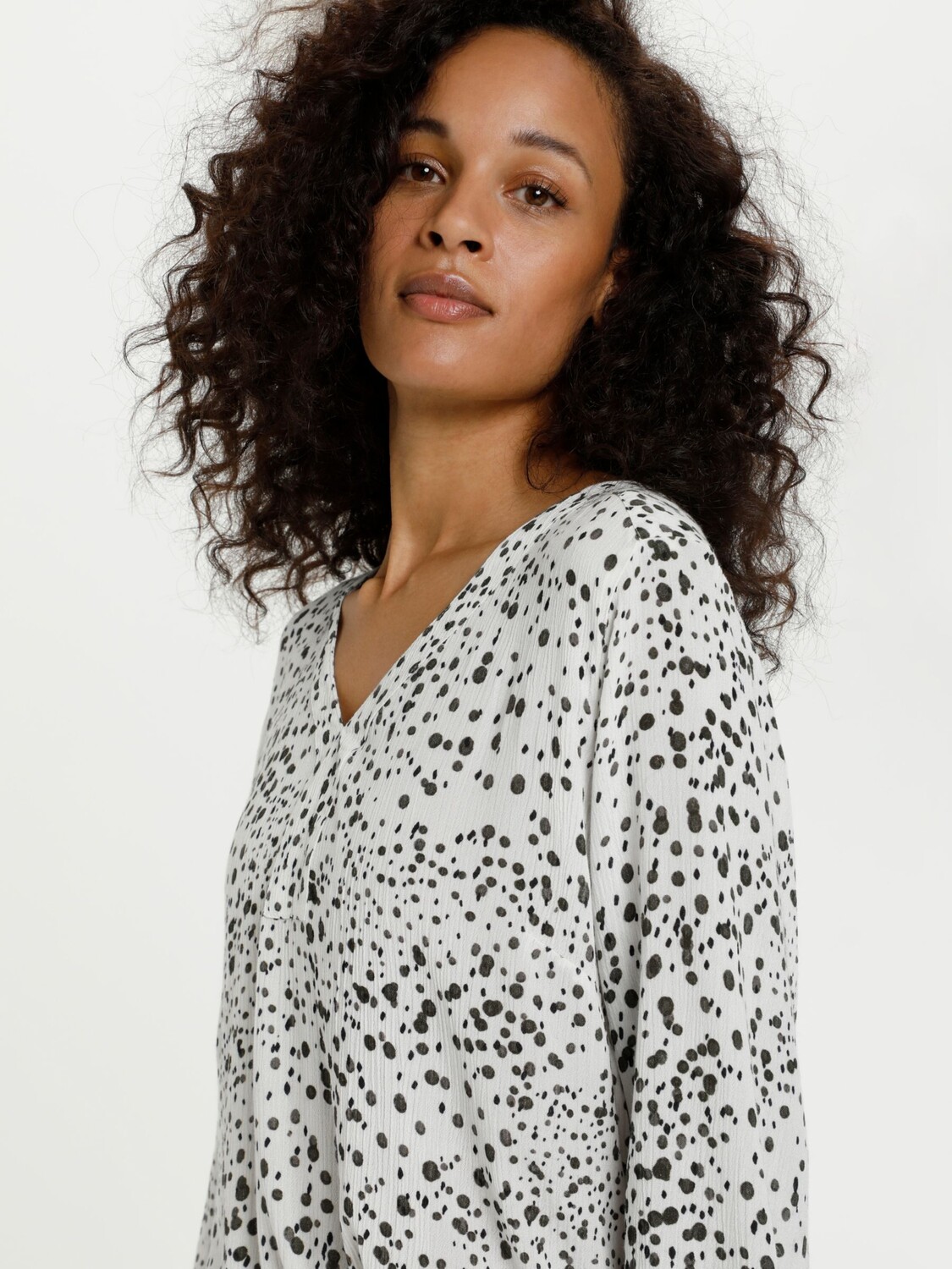 Эта блузка от KAFFE, усеянная пятнами, станет легким выбором.| Благодаря привлекательному V-образному вырезу и длинным рукавам она изготовлена из легкой, но прочной ткани и легко впишется в повседневную одежду.