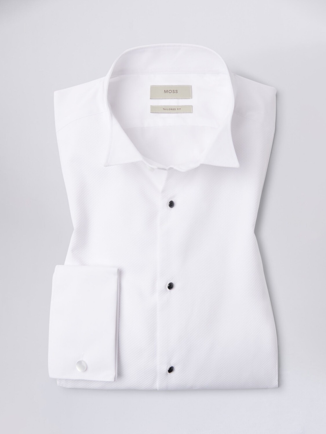 Избавьтесь от догадок при создании образа с черным галстуком с помощью белой классической рубашки Мосса, изготовленной по индивидуальному заказу из чистого хлопка с переплетением добби Марселла, которое придает ощущение жесткости и, в свою очередь, добавляет формальности. | Воротник-крыло делает все правильно. Заявления, а двойные манжеты создают чистый фон для выбранных вами звеньев - мы бы использовали перламутровый компенсатор с черными заклепками через планку.