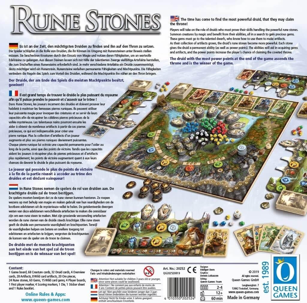 Rune Stones — это игра для построения колоды и управления руками, разработанная известным дизайнером Рюдигером Дорном. В Rune Stones каждая карта имеет уникальный номер. Две карты всегда играют вместе, и карта с более высоким номером удаляется из колоды игрока. Вы должны быть осторожны, какие карты вы покупаете и как вы их разыгрываете, чтобы не потерять свои лучшие карты. Игроки будут использовать свои карты, чтобы собирать драгоценные камни, превращать их в артефакты, а затем объединять их в рунические камни, что дает особую способность до конца игры. Чем больше артефактов используется при создании рунического камня, тем больше очков он приносит, поэтому игроки должны решить, лучше ли получить способности раньше или сохраниться, чтобы набрать больше очков.