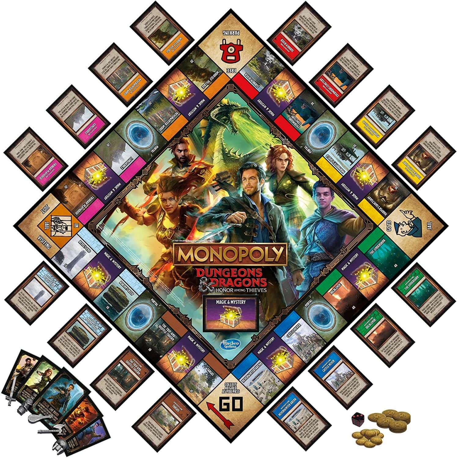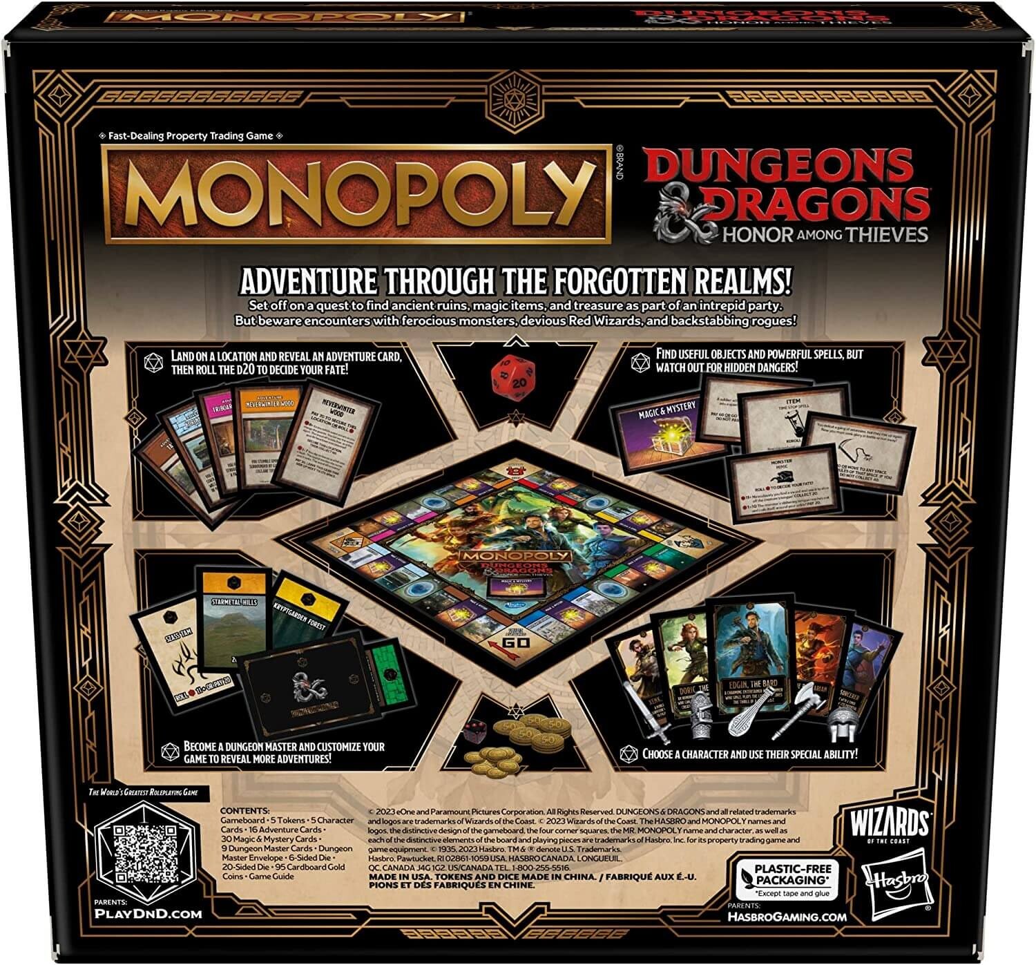Приключения в стране магии и монстров с игрой Monopoly Dungeons & Dragons: Honor Among Thieves, вдохновленной фильмом D&D! В этой захватывающей настольной игре представлены ключевые персонажи и места из фильма. Игроки могут исследовать Забытые Королевства в составе отряда бесстрашных искателей приключений. Откройте для себя приключения на Побережье Мечей и в опасном Подземье, ищите полезные предметы и мощные заклинания и собирайте сокровища. Но остерегайтесь монстров, коварных Красных Волшебников и предательских мошенников! Игра заканчивается, когда все локации захвачены. Побеждает игрок с наибольшим количеством золота!