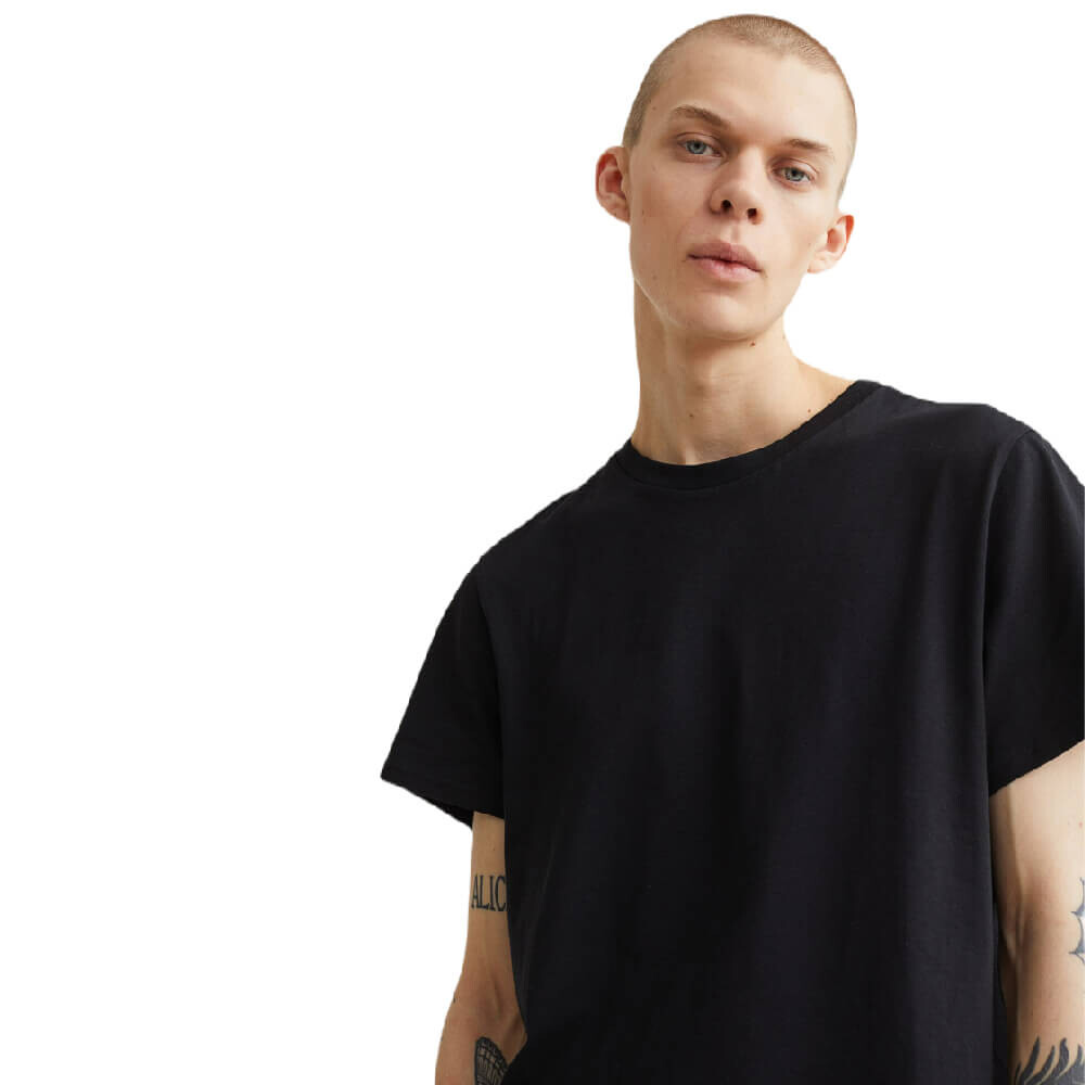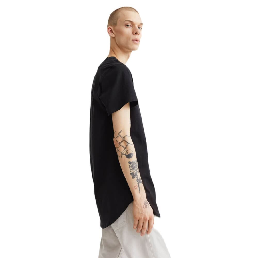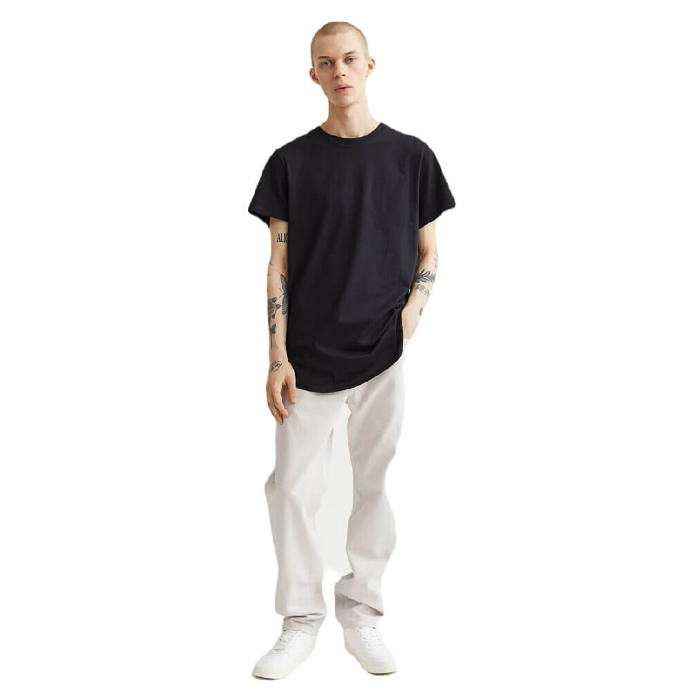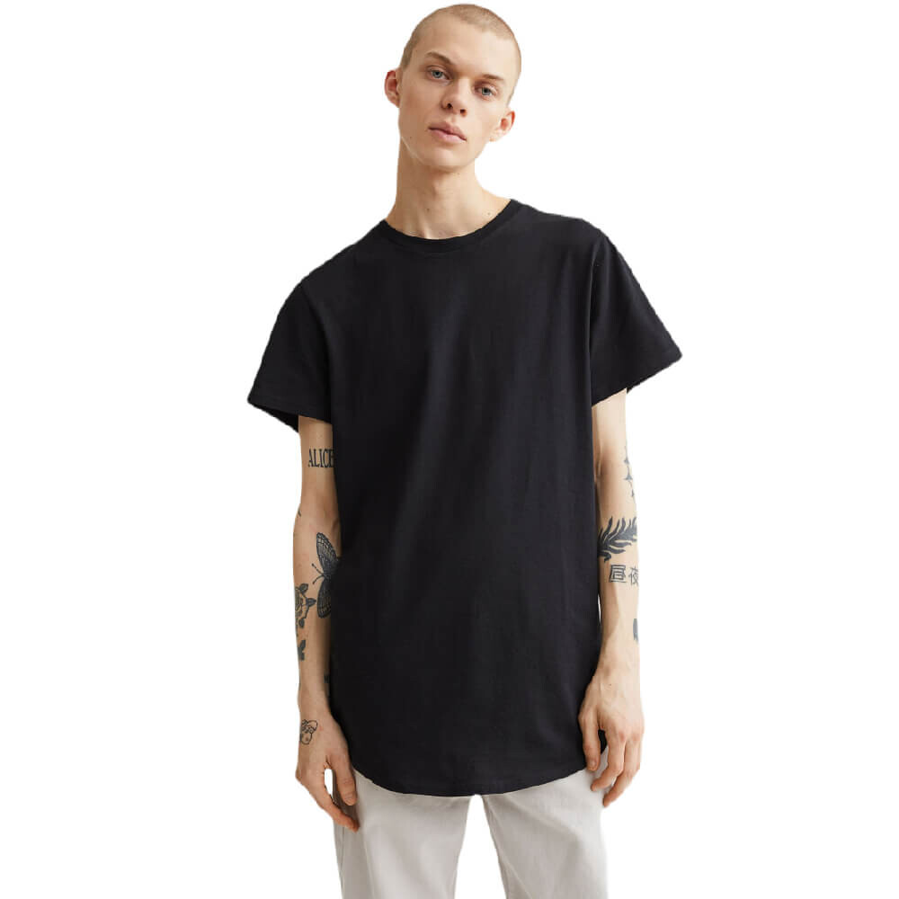 Длинная футболка с ребристым круглым вырезом и закругленным подолом. Классический крой для комфортной носки и классического силуэта.