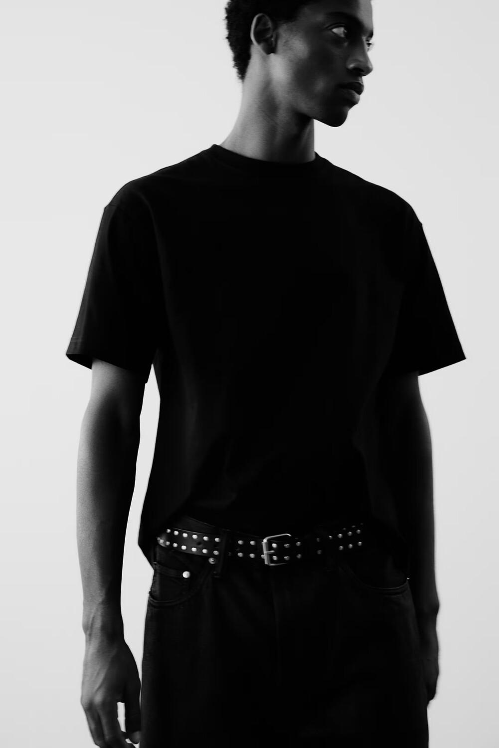 Футболка из плотного хлопкового трикотажа с круглым вырезом в рубчик, заниженной линией плеч и прямым краем. Свободный крой, просторный, но не слишком объемный силуэт.