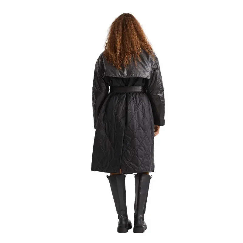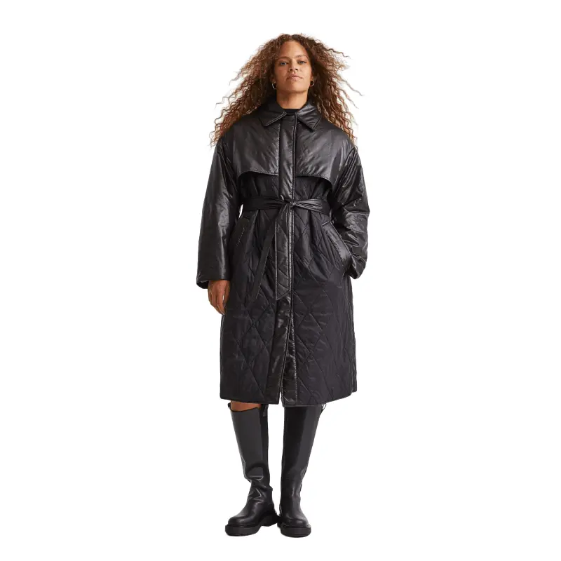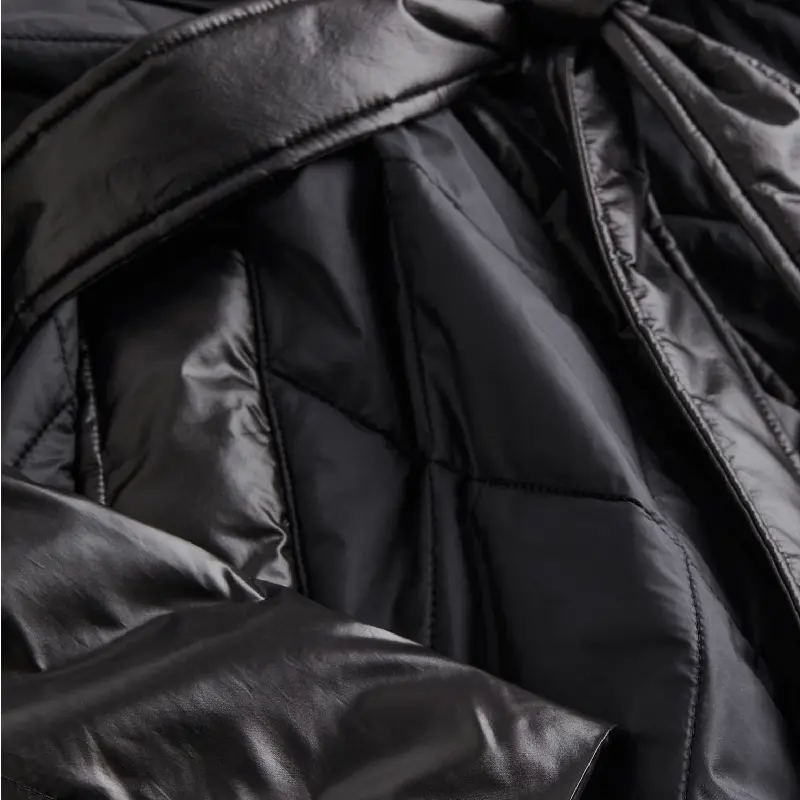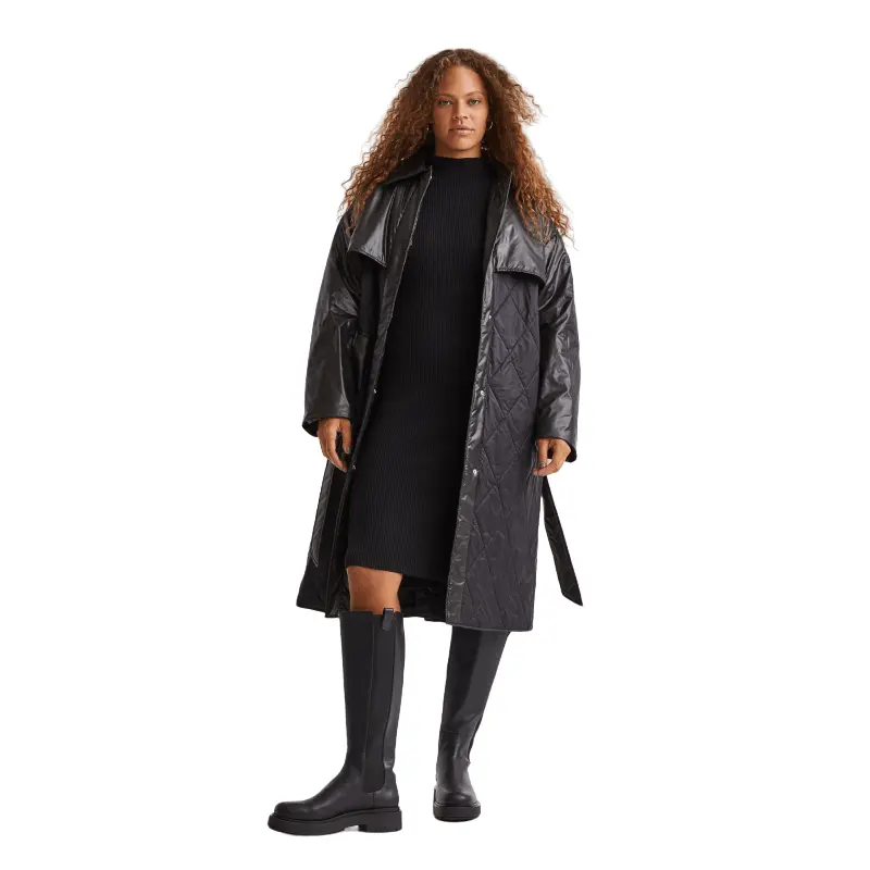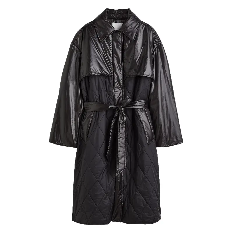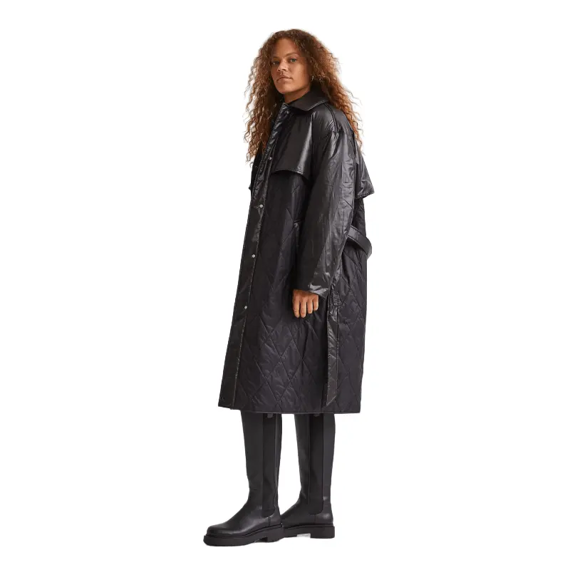 Пальто оверсайз из стеганой ткани с контрастными тканевыми вставками. Заостренный воротник, кокетка, потайные кнопки спереди и свободная кокетка сзади. Заниженная линия плеча, косые прорезные карманы и съемный пояс на талии. Прямой низ и разрез сзади.