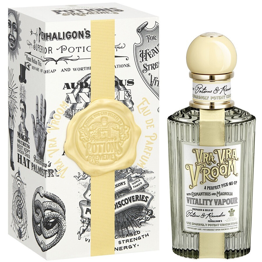 Penhaligon's Vra Vra Vroom — кожаный аромат с отблесками цветов и фруктов. Энергичный всплеск цветов османтуса в сочетании с бодрящей магнолией. Этот живительный аромат наполняет обладательницу энергией. Прощай, апатия.