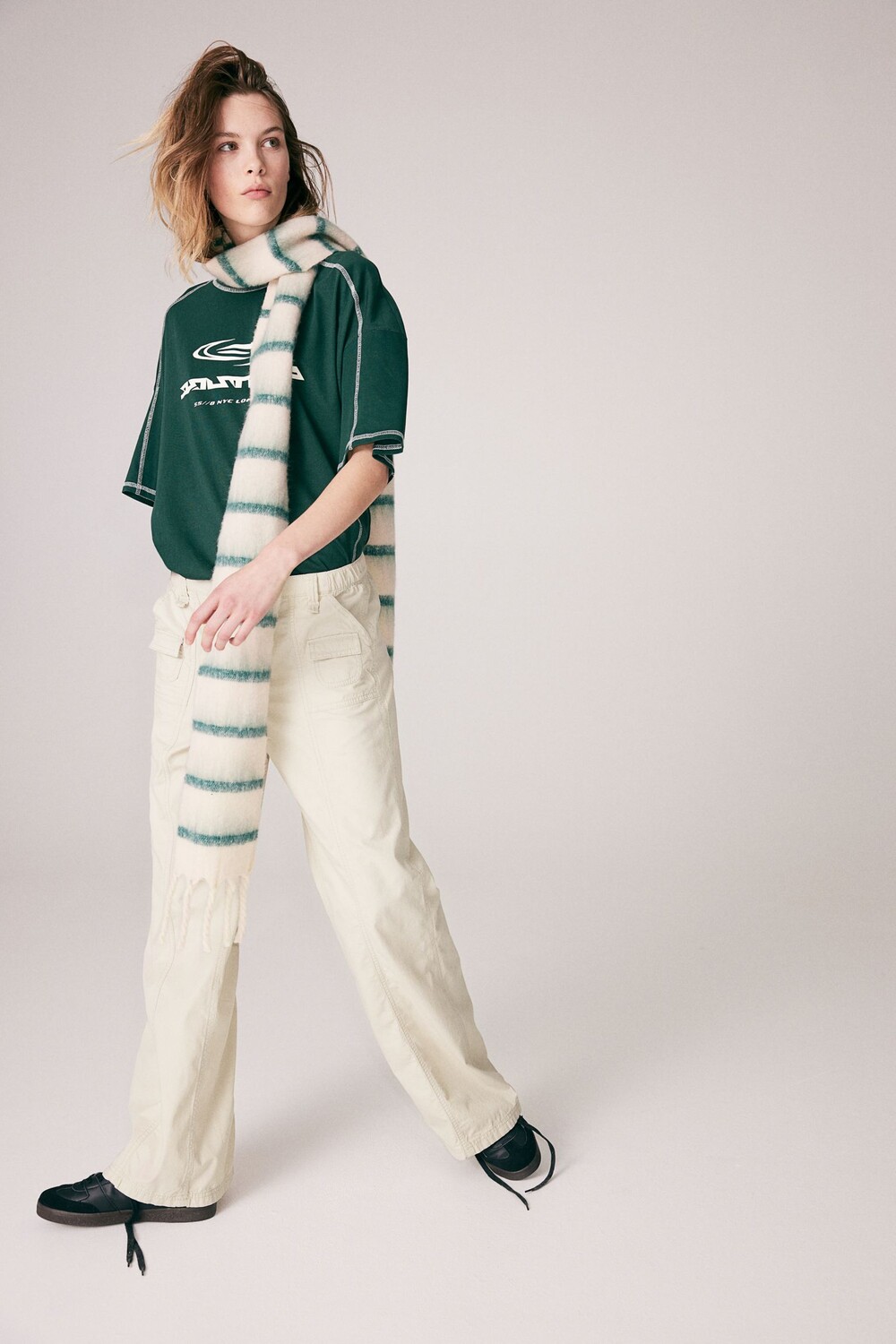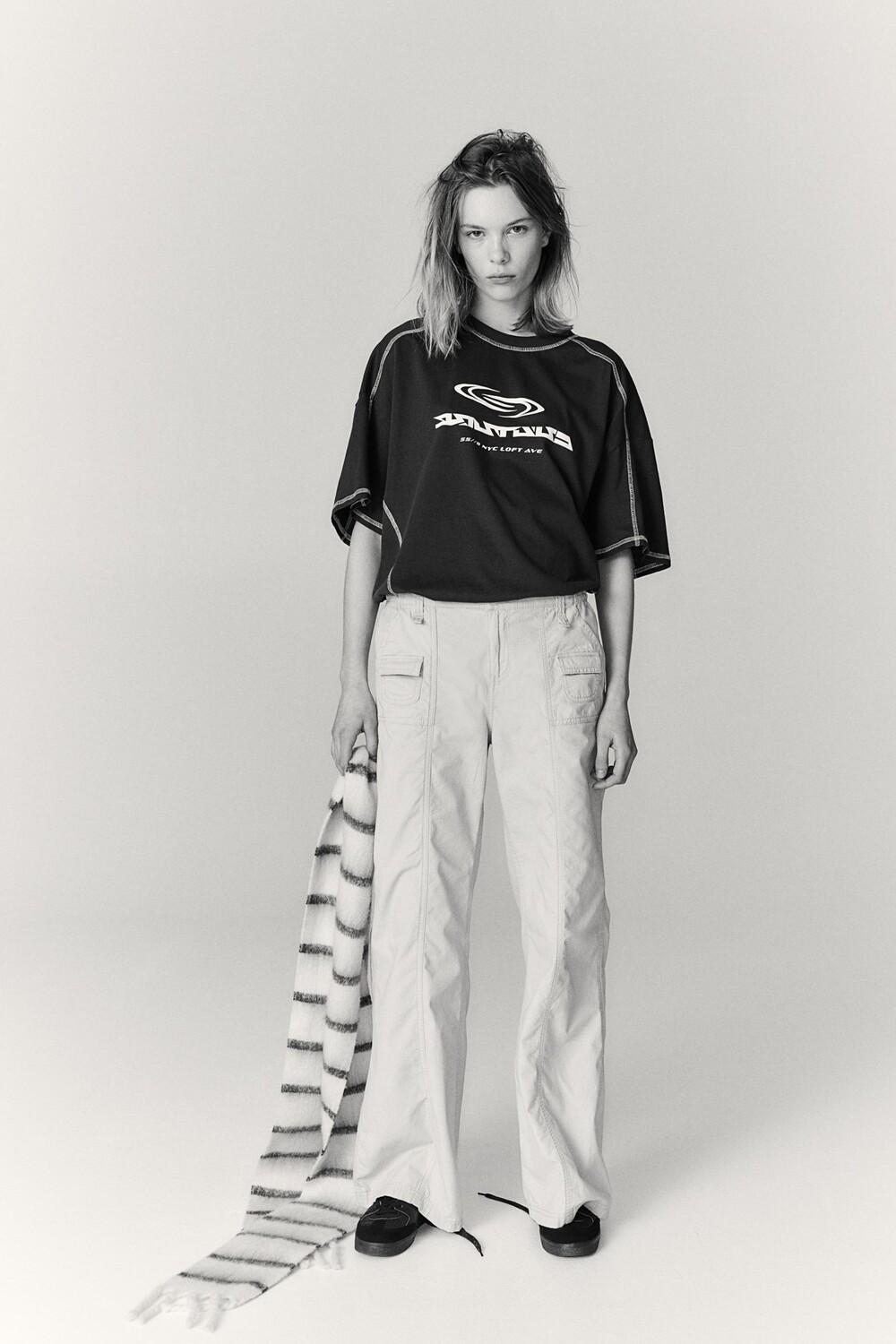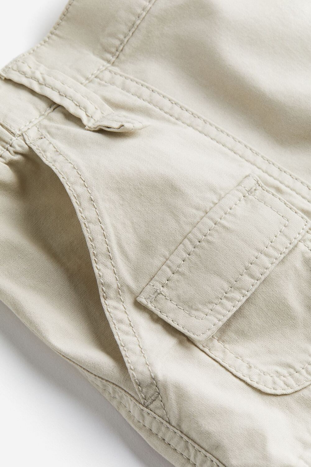 Брюки-карго из хлопковой парусины. Заниженная талия, резинка сзади и по бокам талии. Ширинка на молнии и кнопке. По бокам диагональные карманы, каждый с дополнительным карманом с клапаном. Прямые штанины с простроченными краями спереди и сзади.