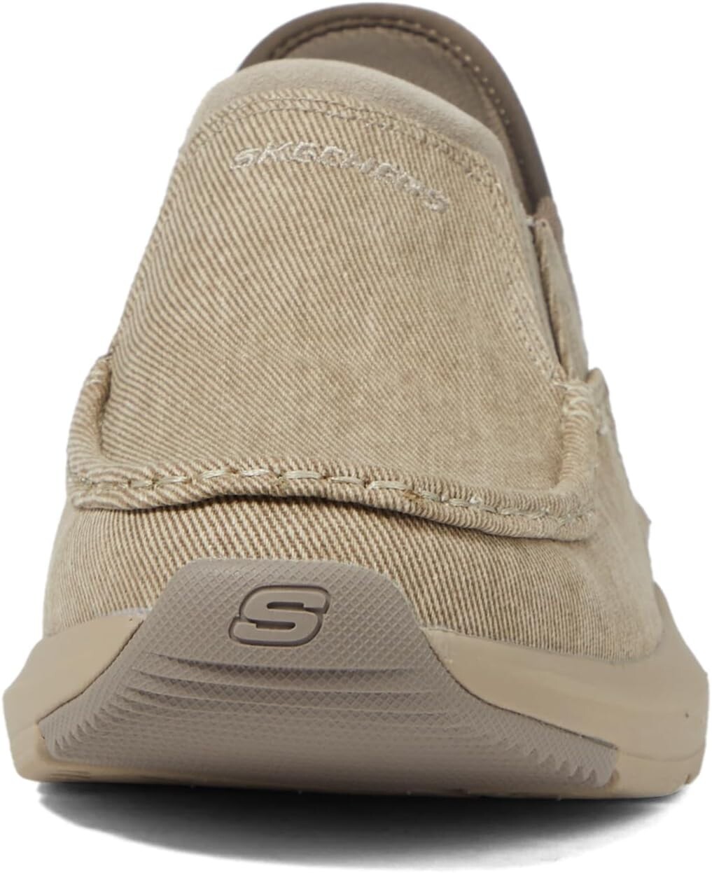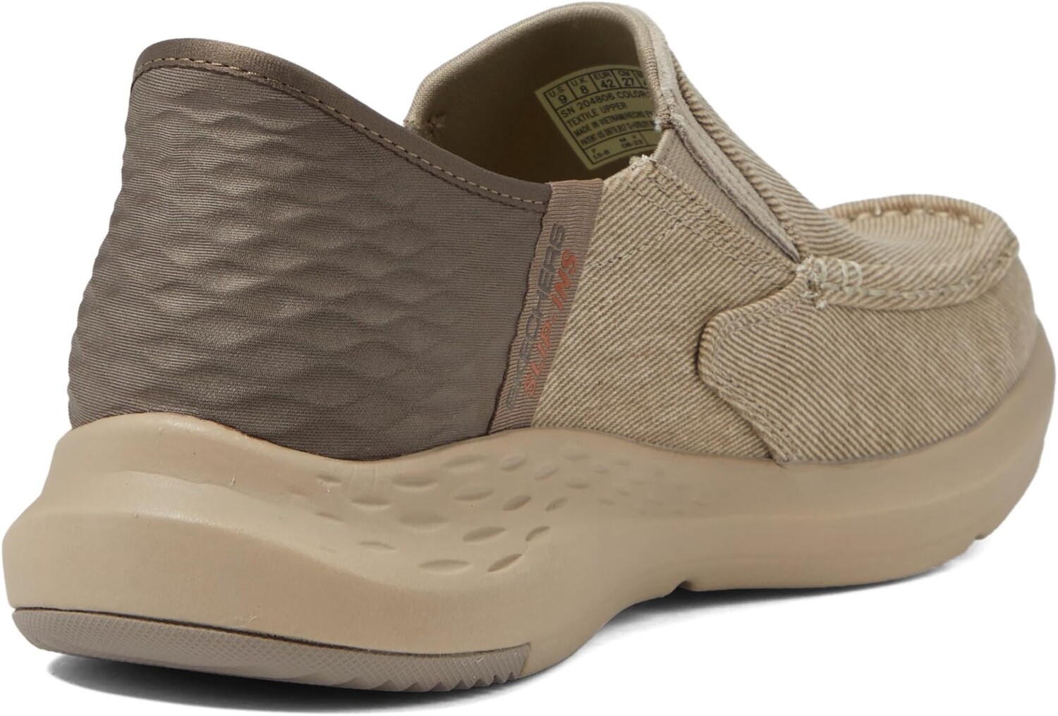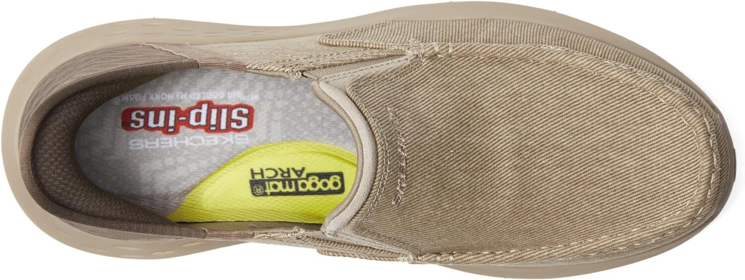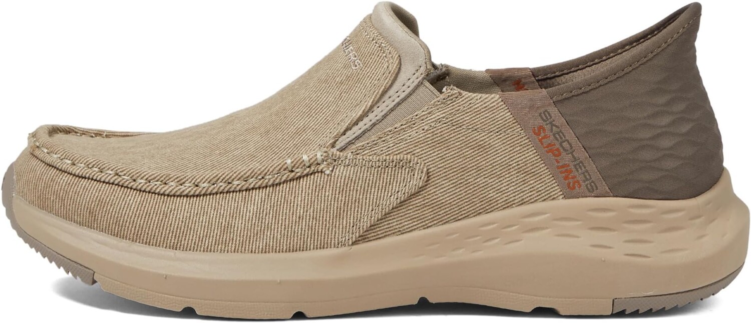 Туфли SKECHERS Slip-Ins: Parson - Dewitt без шнуровки с верхом из парусины. Эти повседневные и модные кроссовки оснащены мягкой мягкой стелькой из пеноматериала с эффектом памяти и технологией Relaxed Fit, обеспечивающей просторную и удобную посадку в области носка и передней части стопы.