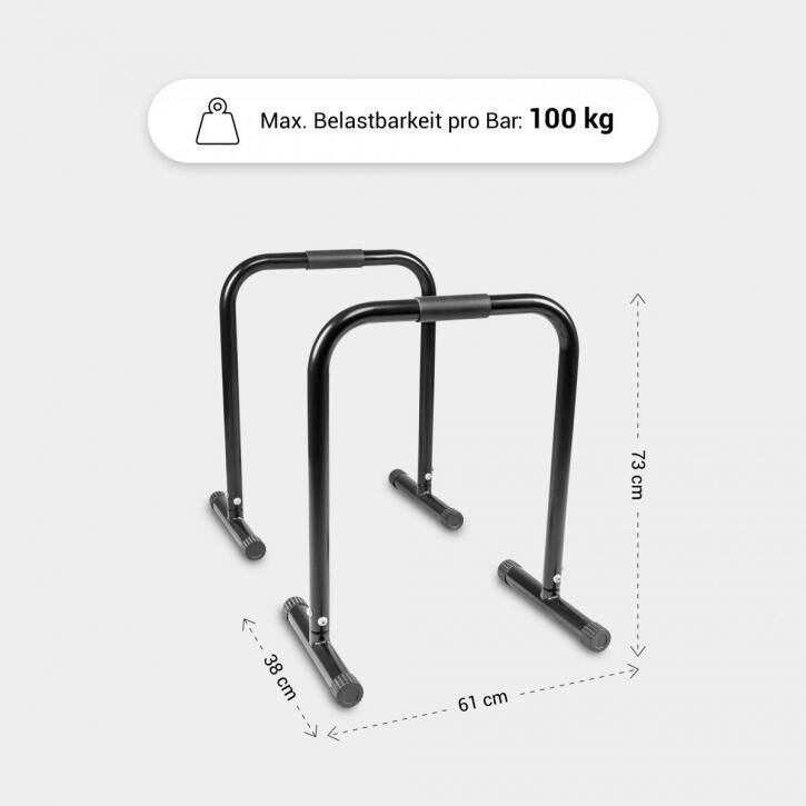 Простая конструкция, огромный эффект: эти параллеты являются идеальными инструментами для разнообразные упражнения с собственным весом. Каждая отдельная стойка для отжиманий состоит из прочной трубчатой стальной рамы и может выдерживать нагрузку до 100 кг. Поперечные ножки с резиновыми накладками для защиты пола обеспечивают надежную опору. И самое главное: эти перекладины мобильны и позволяют вам тренироваться как в помещении, так и на открытом воздухе! Вы получаете погружные брусья разных цветов.