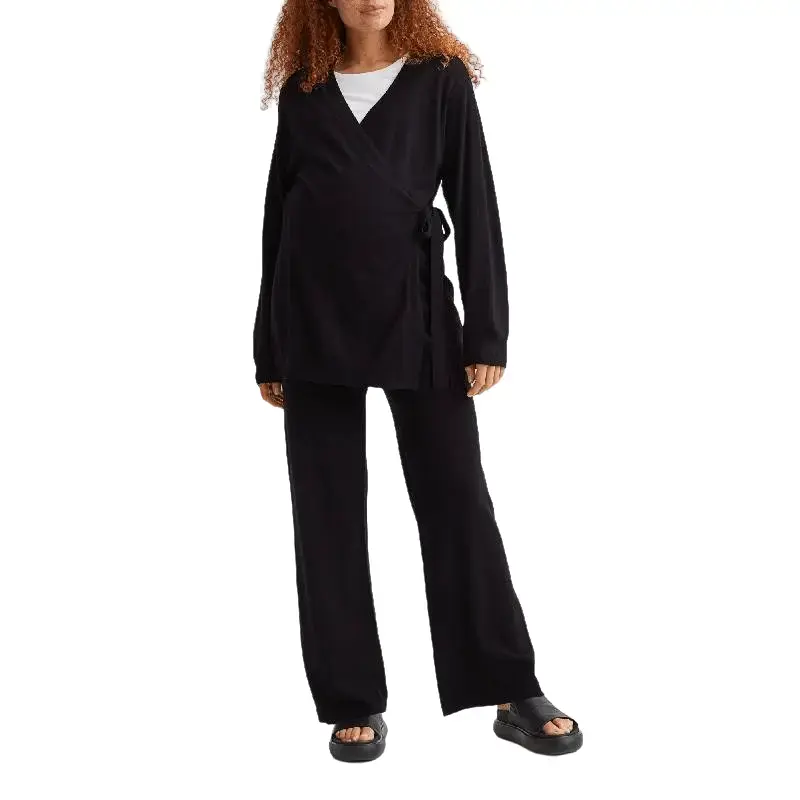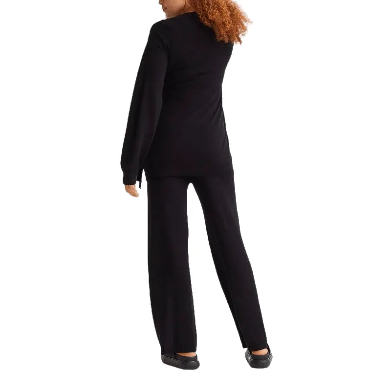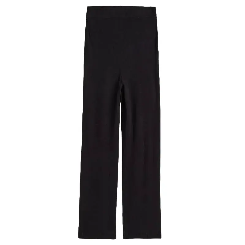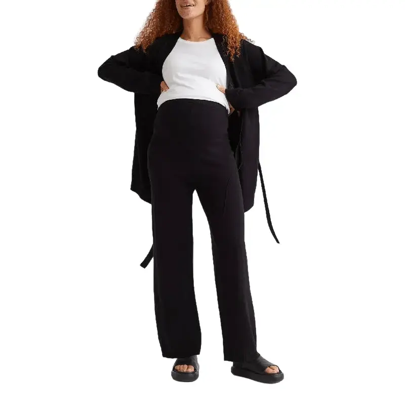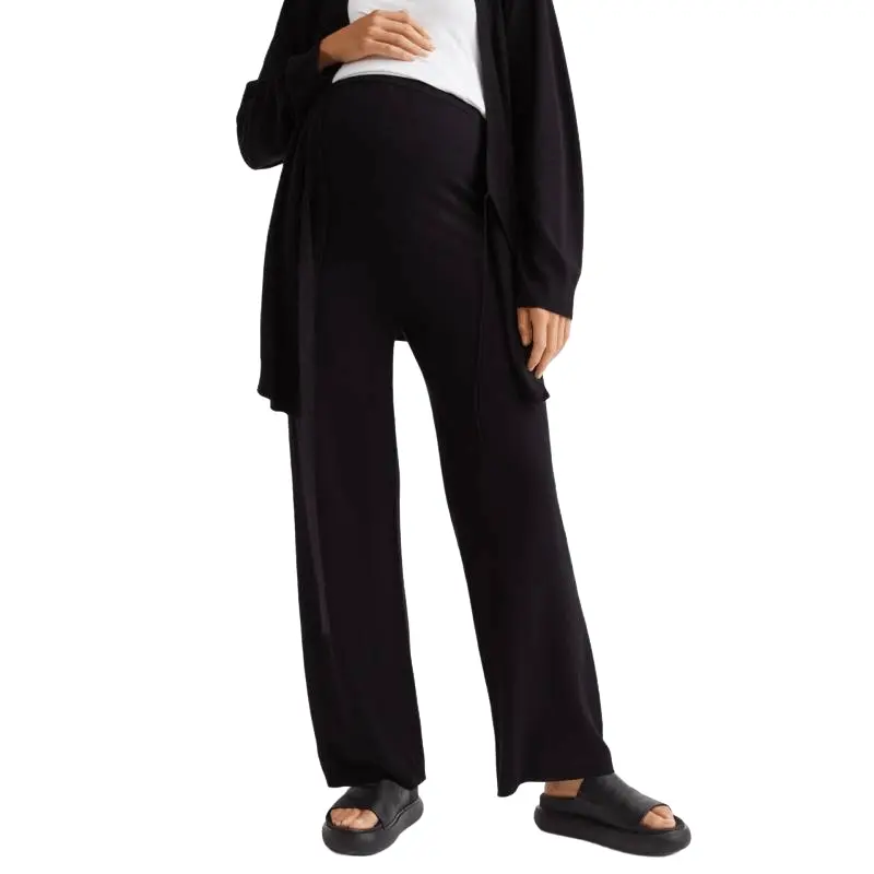Трикотажные брюки для беременных из смесовой вискозы. Брюки имеют высокий ребристый пояс и длинные широкие штанины с ребристыми краями.