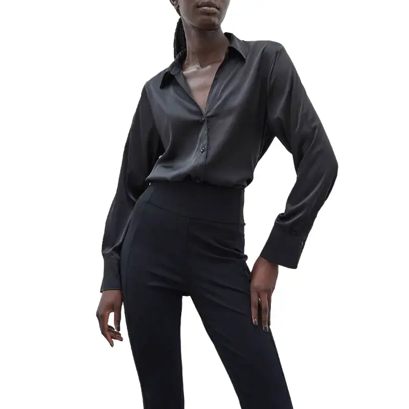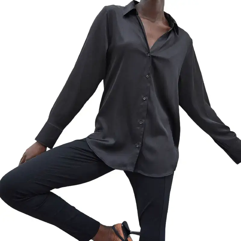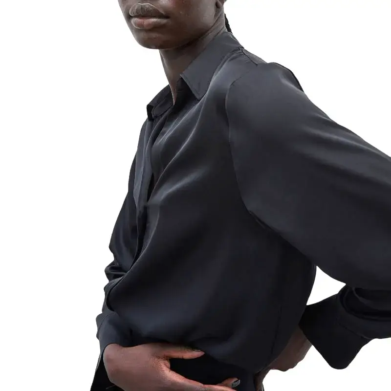 Блузка с длинными рукавами из блестящей ткани. Блузка имеет V-образный вырез с воротником, пуговицы спереди и манжеты на пуговицах. Закругленный низ.