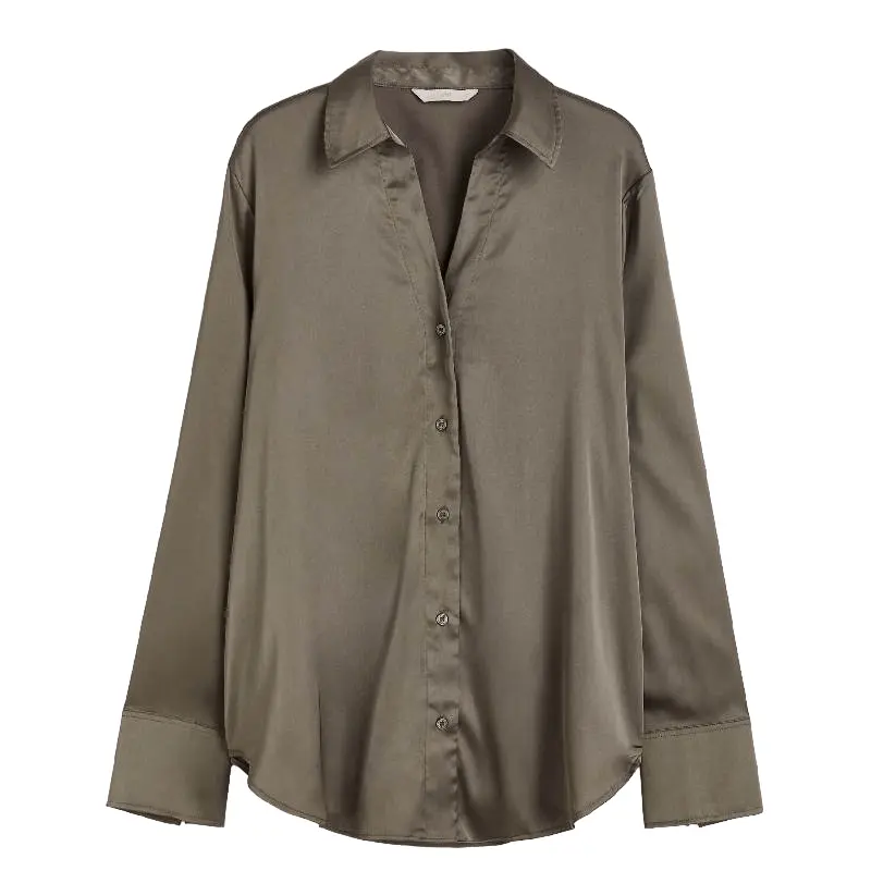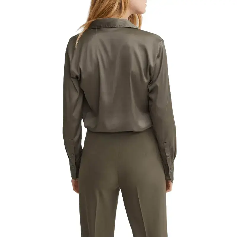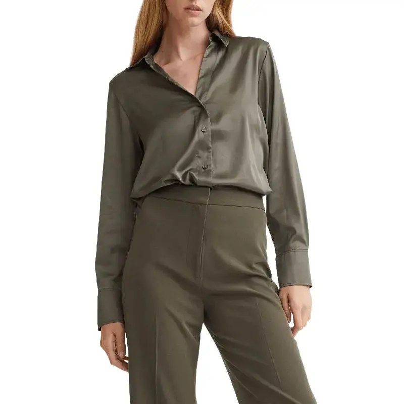 Блузка с длинными рукавами из блестящей ткани. Блузка имеет V-образный вырез с воротником, пуговицы спереди и манжеты на пуговицах. Закругленный низ.