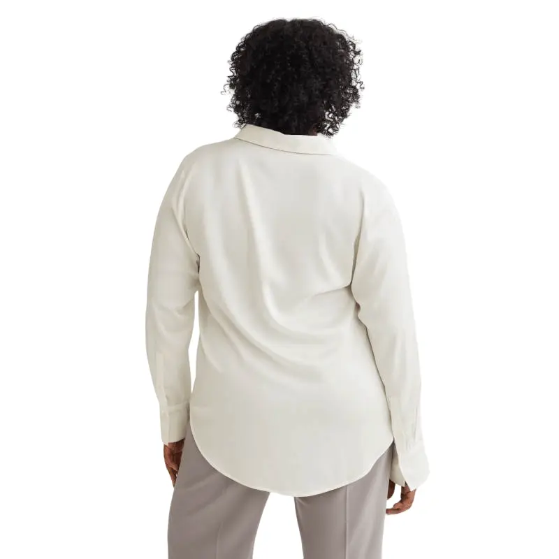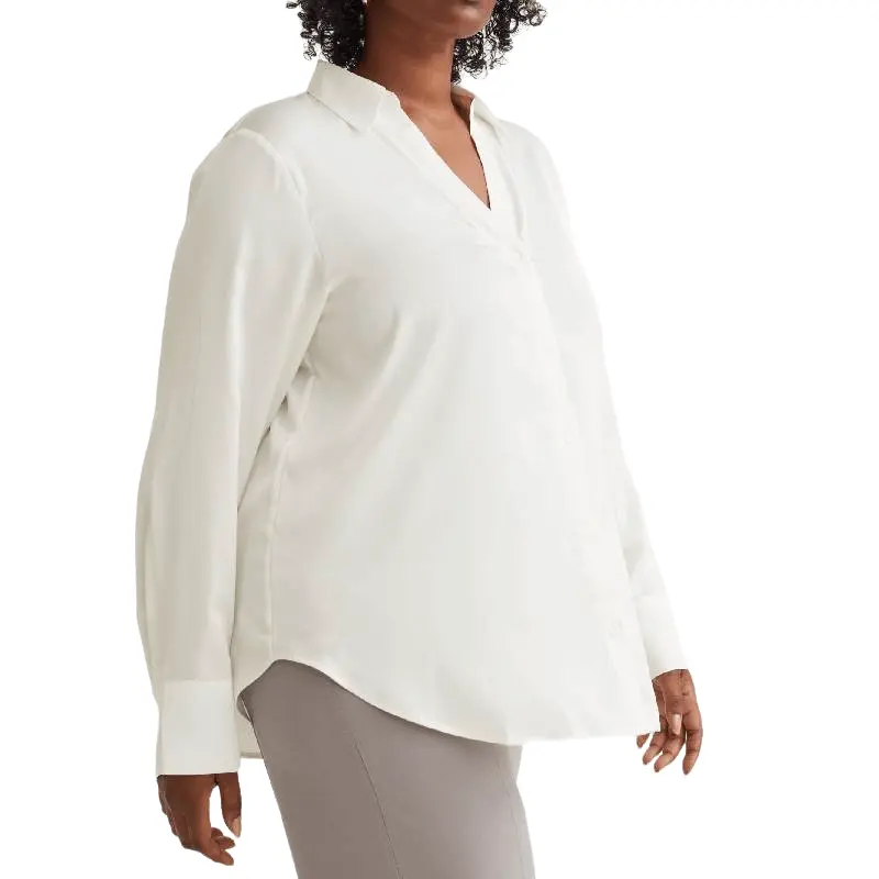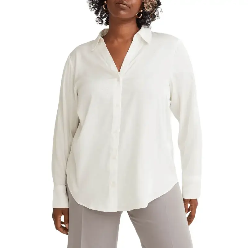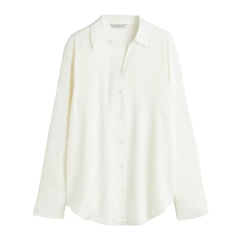 Блузка с длинными рукавами из блестящей ткани. Блузка имеет V-образный вырез с воротником, пуговицы спереди и манжеты на пуговицах. Закругленный низ.