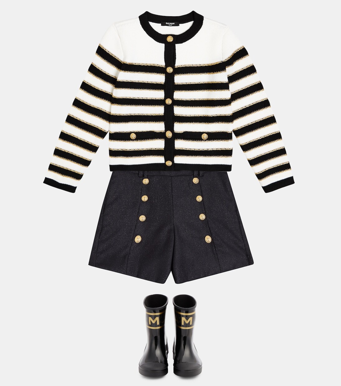 Эти шерстяные шорты от Balmain Kids', выполненные в костюмном стиле, выглядят элегантно, а эластичный пояс добавляет комфорта. Они добавляют гламурности и украшены золотистыми пуговицами — отличительной чертой дизайна бренда. Материал: 98 % шерсть, 1 % полиамид, 1 % металлизированное волокно. Рекомендации по уходу: сухая чистка. Сделано в Албании. Подкладка: 100% вискоза. Застежка: молния сзади.