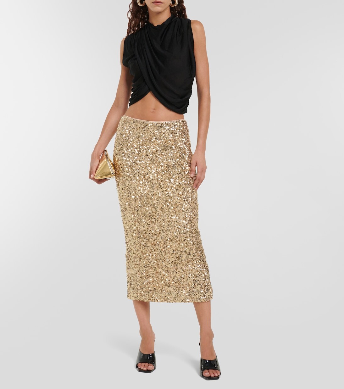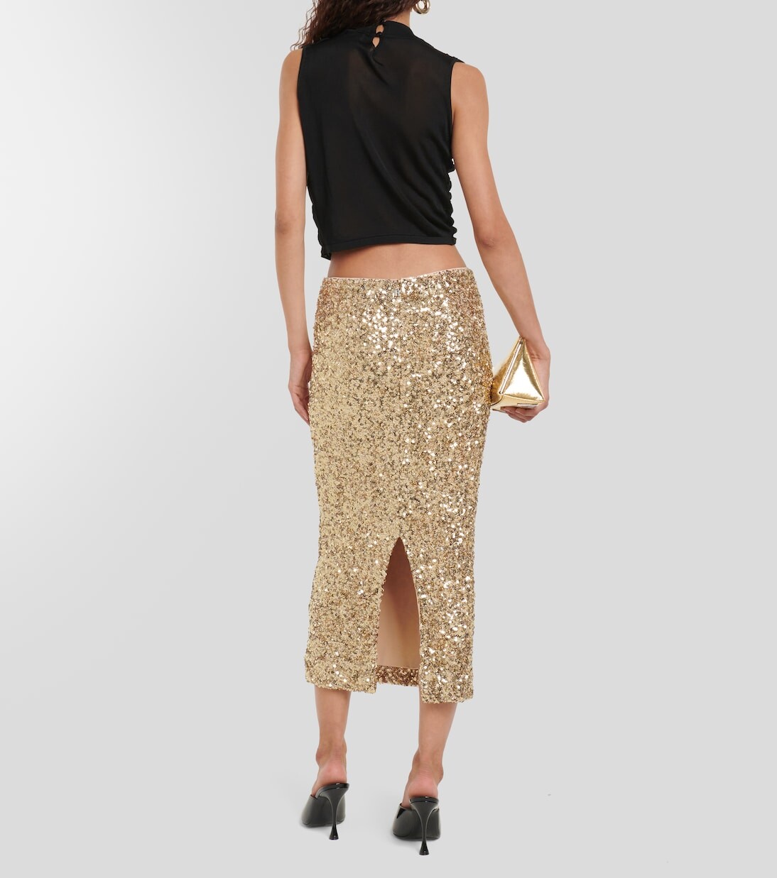Эта блестящая юбка миди от Rotate Birger Christensen создана для танцевальной ночи. Созданная для плотного прилегания модель покрыта золотистыми блестками и имеет разрез сзади, создающий соблазнительный вид. Материал: 95 % переработанный полиэстер, 5 % эластан. Рекомендации по уходу: сухая чистка. Сделано в Китае. Материал II: 100 % переработанный полиэстер. Подкладка: 95% полиэстер, 5% эластан. Застежка: молния сзади.