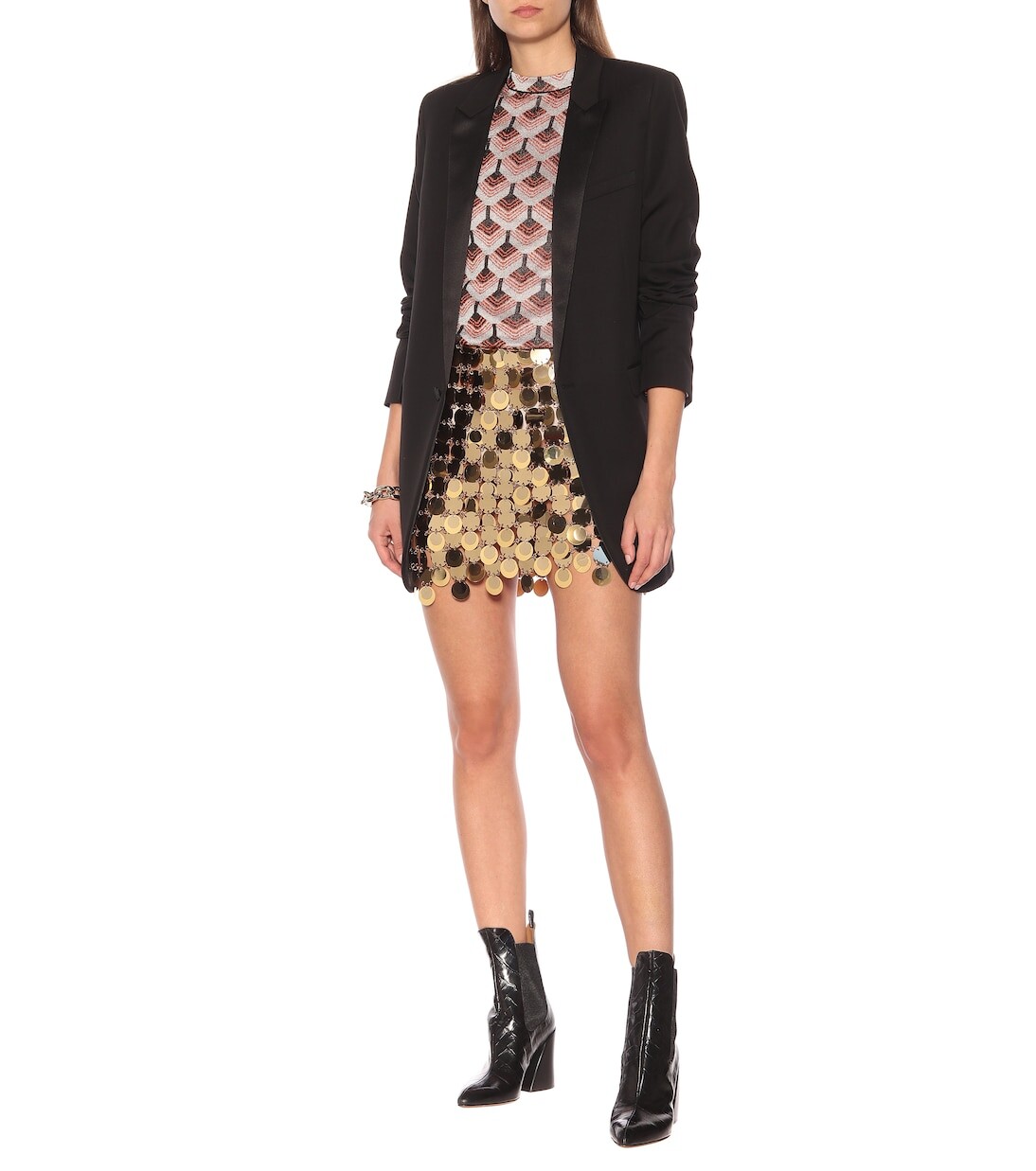 Мини-юбка от Paco Rabanne с мерцающими пайетками, сшитыми вместе, является визитной карточкой стиля 60-х годов. Золотое изделие имеет высокую талию и короткий подол для дополнительного эффекта. Нам нравится, как влиятельные лица со всего мира стилизовали эту вещь: с белоснежной рубашкой для контраста. Материал: 40% латунь, 60% пластик. Рекомендации по уходу: не чистить.