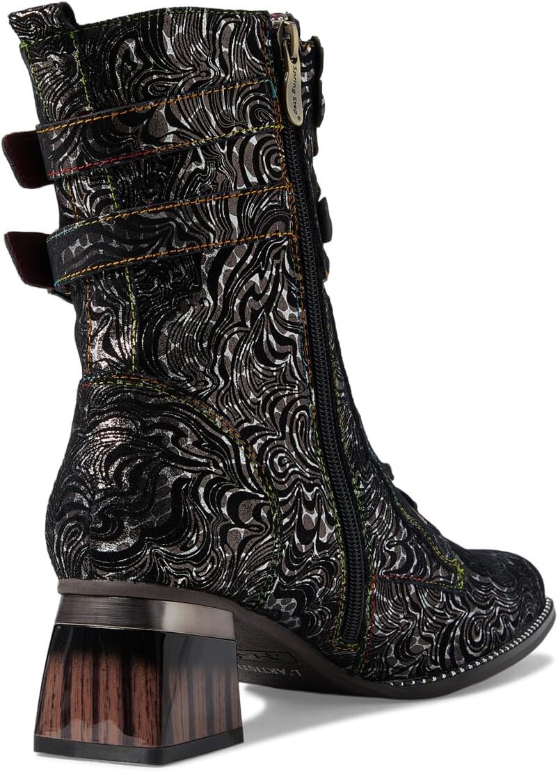Окунитесь в городской шик с этими ботильонами L'Artiste от Spring Step Originala из металлизированной замши с принтом в стиле поп-арт, филигранными пуговицами, объемными аппликациями в виде цветов и массивным блестящим каблуком с оловянной отделкой. С ленточными шнурками в тон, боковой застежкой-молнией внутри, бархатной подкладкой с принтом пейсли и мягкой стелькой для комфорта в течение всего дня.