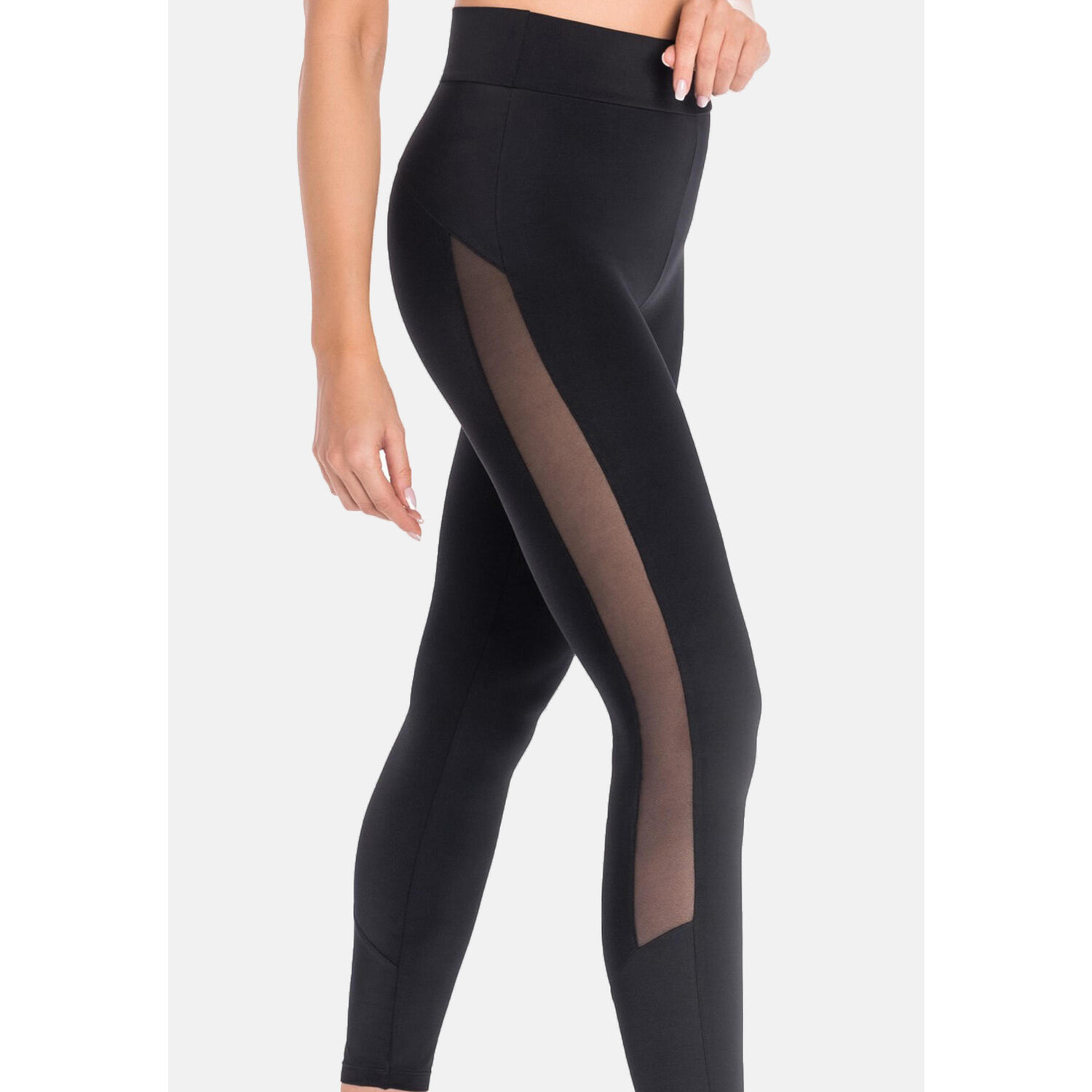 Черные женские спортивные леггинсы в сочетании с нежной прозрачной сеткой по бокам штанины насыщенного черного цвета. Они изготовлены из качественного, эластичного и нежного материала, который выгодно подчеркивает силуэт и подчеркивает его достоинства. Леггинсы приятны на ощупь и предназначены для активных женщин, которые любят заниматься разными видами спорта. Они очень удобны для занятий фитнесом, езды на велосипеде или бега трусцой. Имеют завышенную талию, благодаря чему моделируют силуэт и скрывают недостатки, выступающие животы или бока, которые не нравятся женщинам. Сзади леггинсы имеют разрез, который делает низ красивым и круглым, приподнимая его. Пояс имеет двойной слой материала, который удерживает леггинсы на месте и предотвращает их сползание во время приседаний. Вдоль штанин, от талии до икр, проходит тонкая прозрачная сетка, нежная на ощупь и делающая леггинсы легкими и эффектными. Благодаря изгибу ткани леггинсы не выпирают на ягодицах и коленях и не прозрачны. Они подходят как для повседневного использования, так и для занятий различными видами спорта или занятий в тренажерном зале. Длина женских леггинсов достигает щиколоток, благодаря чему ноги кажутся длиннее и стройнее.