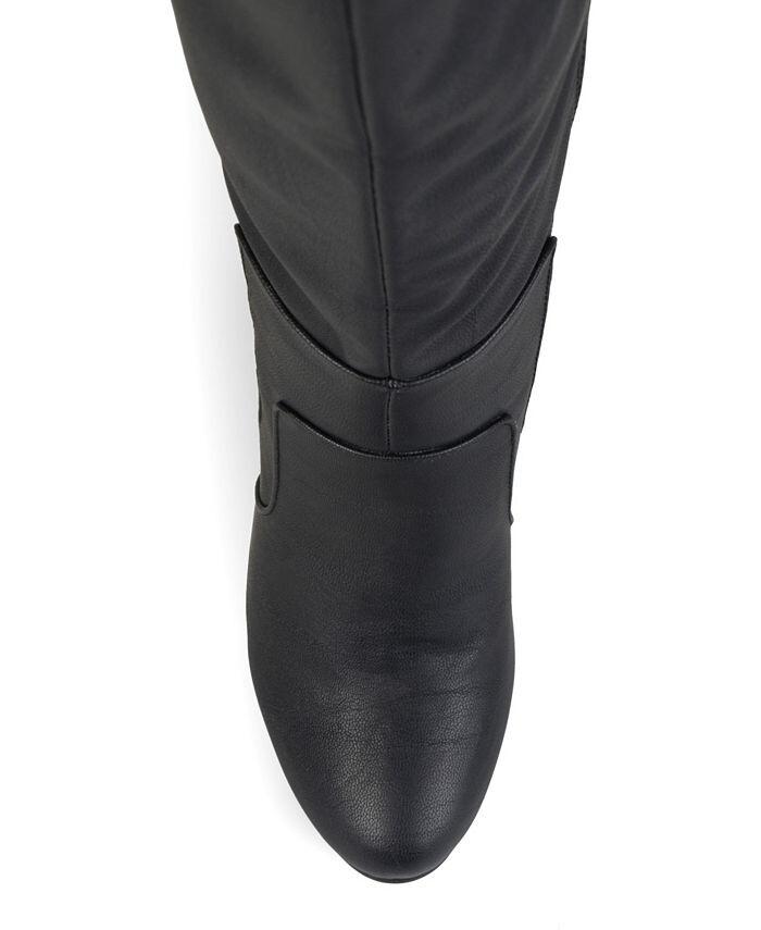 Привлеките внимание в этом сезоне ботинками на каблуке от Journee Collection. Эти стильные ботинки имеют высокие голенища из искусственной кожи (полиуретана), доходящие до середины икры.