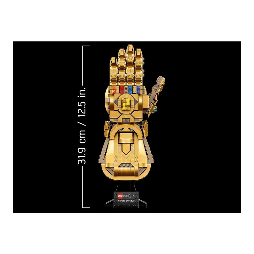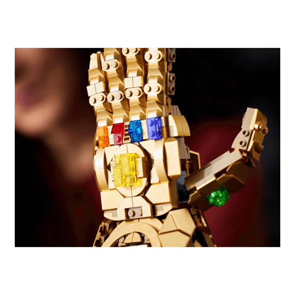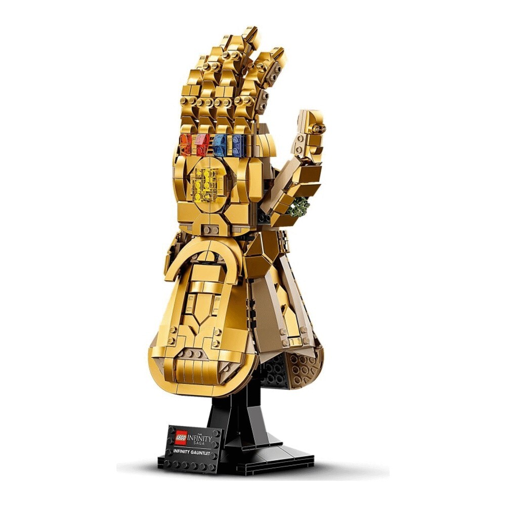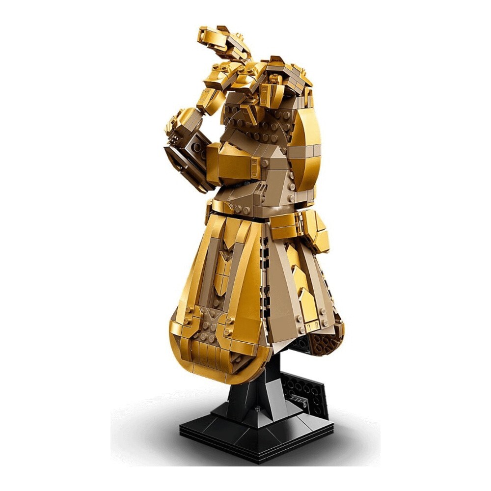 Эта точная модель знаменитой Перчатки бесконечности из золотых кубиков LEGO включает в себя красочные Камни бесконечности и прочную подставку с табличкой с описанием.