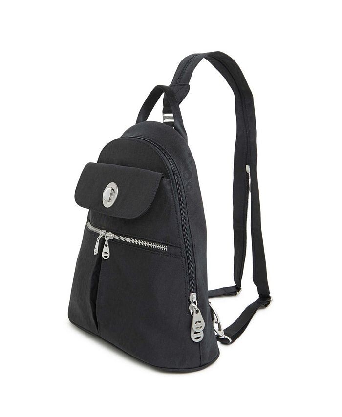 Материал - нейлон, подкладка - полиэстер, отделка - нейлон Сумка небольшого размера - 11" Ш x 12" В x 4 1/2" Г Длина лямки рюкзака - 36" Д, длина ручки - 2" Д. Застежка-молния Внешние детали - матовые. серебристая фурнитура, 1 карман на кнопках, 1 карман на молнии, 1 накладной карман, ремень для ключей. Детали интерьера: 4 внутренних отделения для карт, 1 карман на молнии, 1 накладной карман, 1 держатель для ручек, ремень для ключей. Вес: 1 фунт. Ограниченная гарантия на 1 год. дефекты производителя Протирать влажной тканью. Карман быстрого доступа для телефона. Внутренняя панель с защитой от радиочастотной идентификации и 4 слотами для карт.