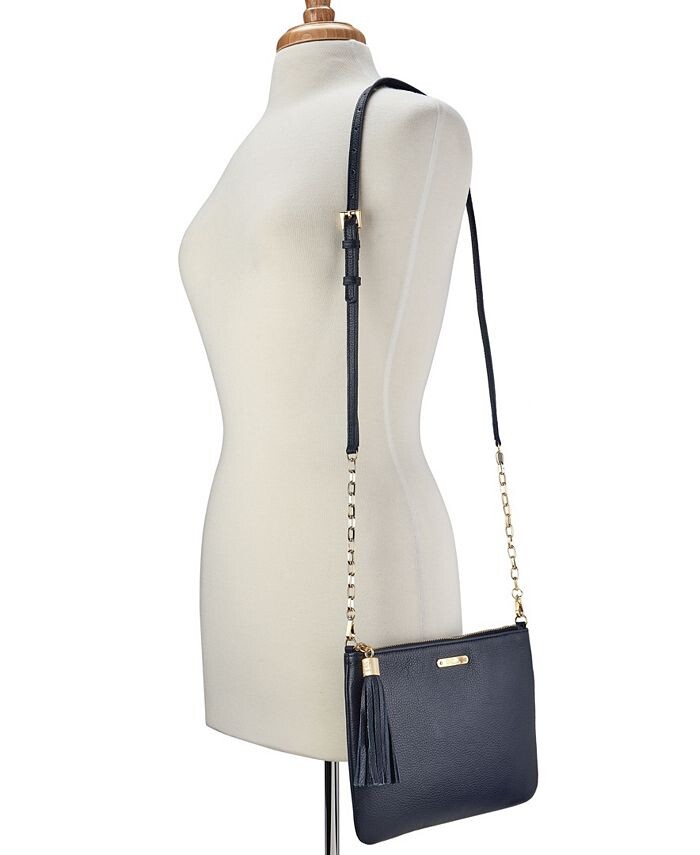 Силуэт основан на модели ростом 5 футов 9 дюймов. Материал - натуральная кожа, отделка - кожа. Сумка небольшого размера - 9,5 дюйма Ш x 7 дюймов В x 0,25 дюйма Верхняя застежка-молния. Съемный регулируемый ремешок длиной 23 дюйма. Внешняя фурнитура золотистого цвета. Табличка с логотипом Внутренний накладной карман Вес изделия — 1 фунт Гарантия 1 год на дефект производителя Этот товар, приобретенный онлайн, должен быть возвращен продавцу только по почте. Этот товар не может быть возвращен в магазины Macy's. Wipe Clean Сделано в США