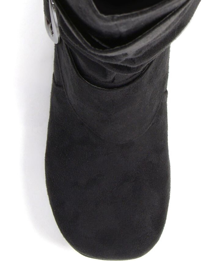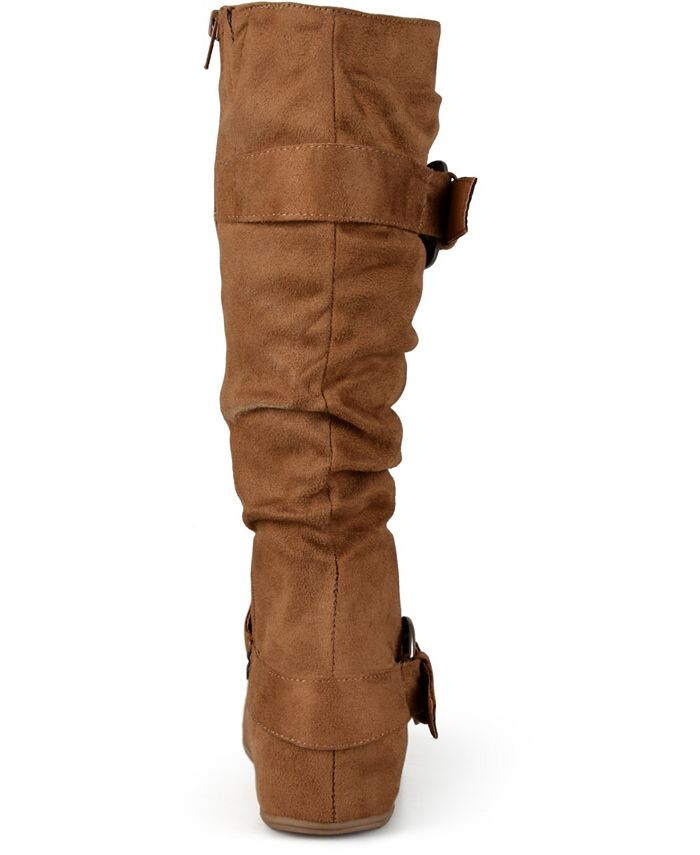 Окунитесь в модный стиль с ботинками с плоскими пряжками от Journee Collection. Эти обязательные высокие ботинки имеют верх из гладкой искусственной замши (полиэстера, полиуретана) с широкой икрой и изящным стилем с напуском, поднимающимся до середины икры.