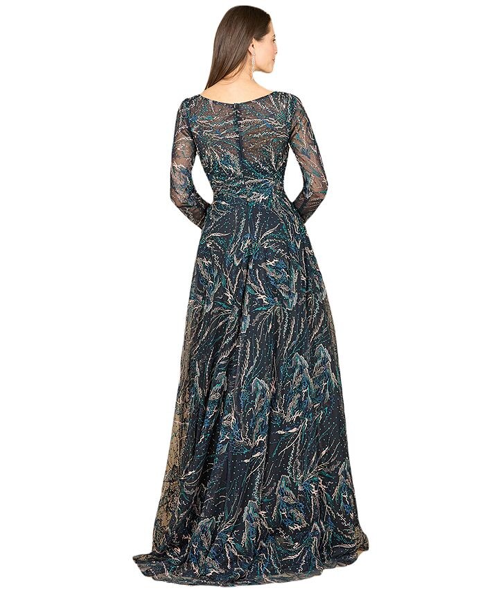 Великолепное бальное платье с цветочным узором, V-образным вырезом и прозрачными длинными рукавами. Это великолепное бальное платье скромного дизайна обязательно станет центром внимания на вашем следующем мероприятии.