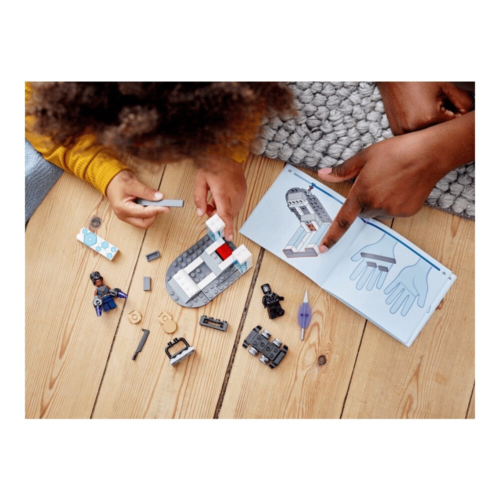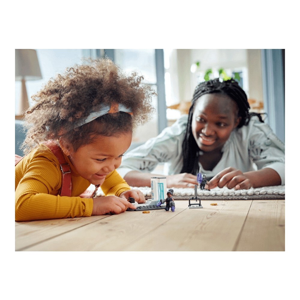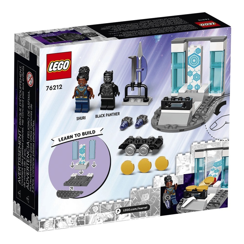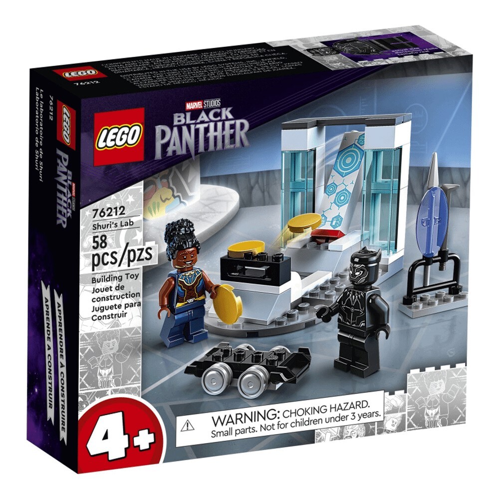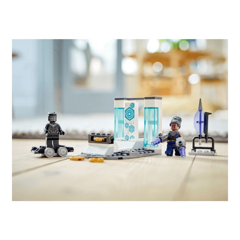 В лаборатории Шури есть все, чтобы занять и развлечь молодых людей. Шури предстоит испытать электрические перчатки, а Черная Пантера промчится на своем ховерборде. Есть даже возможность пострелять по мишеням из дискового шутера. Внутри коробки каждый пакет кирпичиков содержит полную модель и персонажа, которого дети могут быстро собрать, чтобы начать игру! Есть также большой стартовый кирпич, который предоставляет подросткам частично построенную лабораторию для начала строительства.
