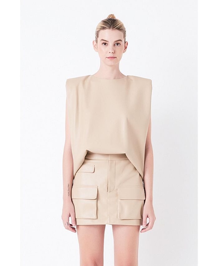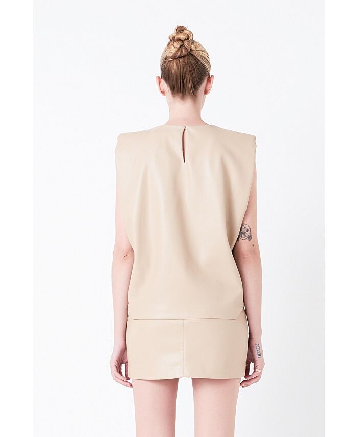 Этот кожаный топ с подплечниками представляет собой идеальное сочетание стиля и комфорта. Модель свободного кроя выполнена из искусственной кожи и имеет стандартную длину без рукавов. Набивка на плечах придает стильный вид любому образу. Благодаря уникальному дизайну этот топ станет идеальным выбором для стильного образа.