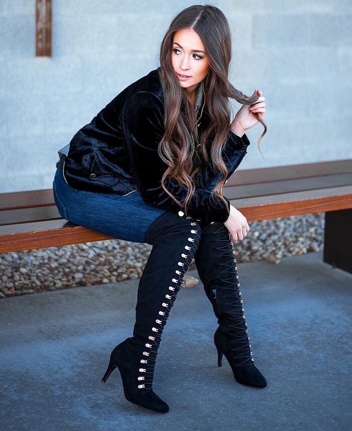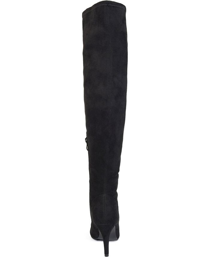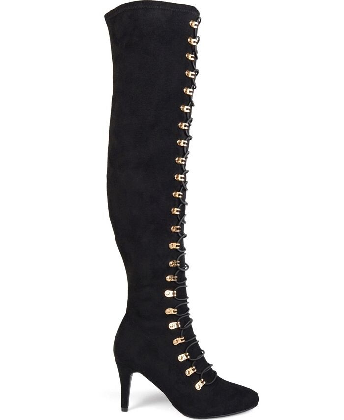 Добавьте искрометный стиль своему образу с помощью ботфортов на высоком каблуке выше колена от Journee Collection. Верх из мягкой искусственной замши возвышается над коленями и подчеркивает винтажный дизайн шнуровки с металлическими деталями.