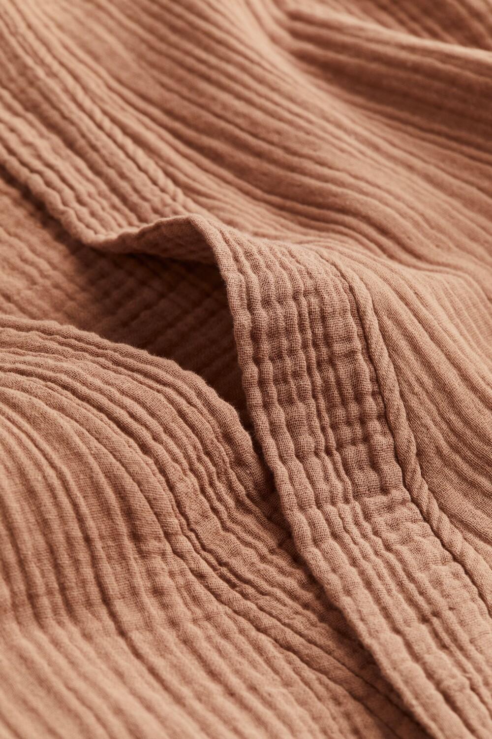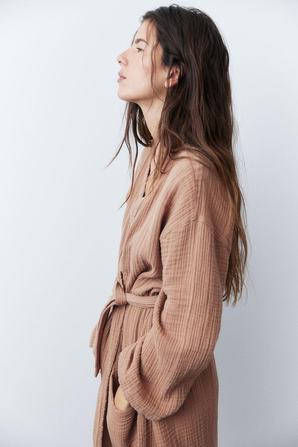 Халат из мягкого хлопкового муслина с шалевым воротником. На талии съемный пояс, накладные карманы спереди.