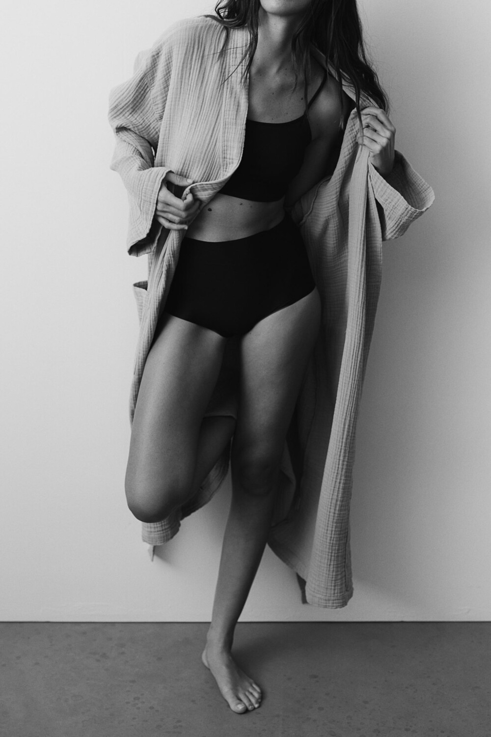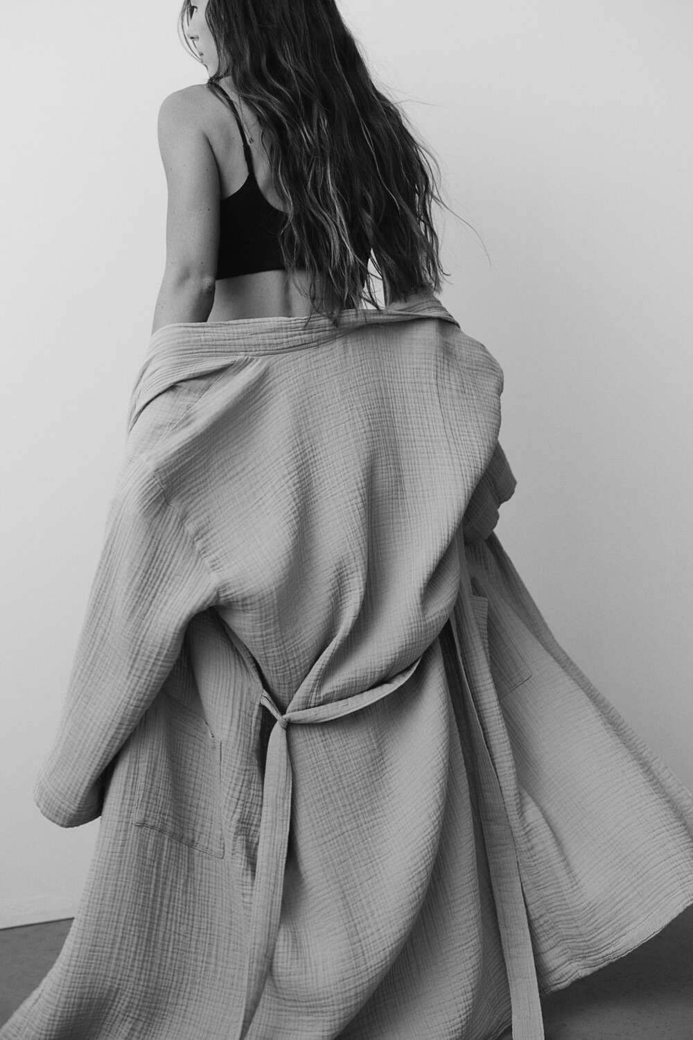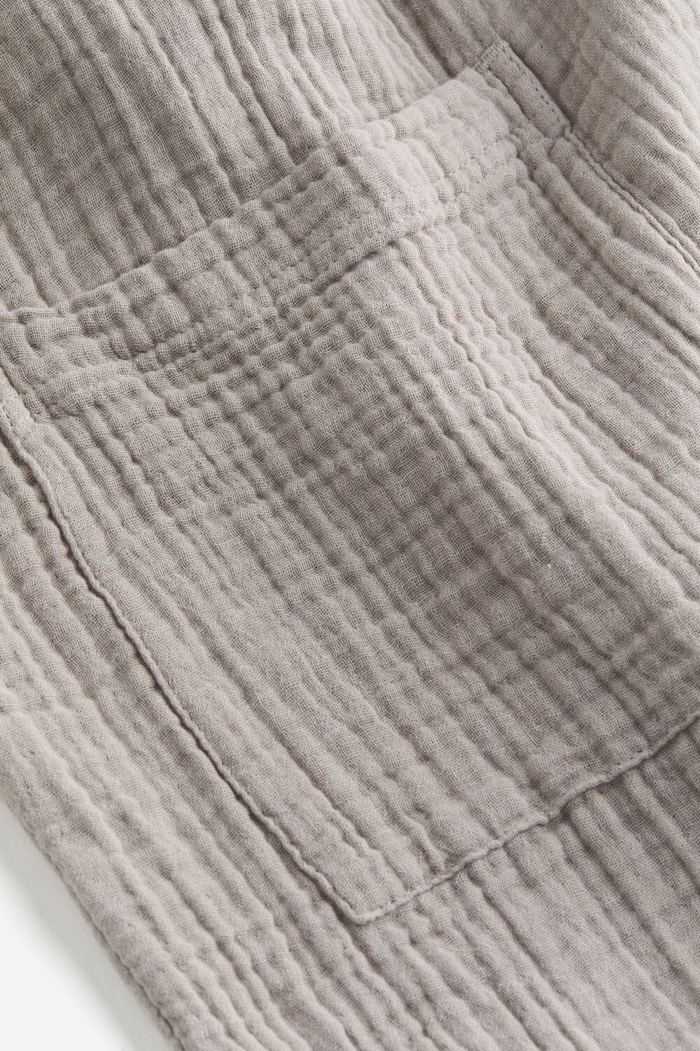 Халат из мягкого хлопкового муслина с шалевым воротником. На талии съемный пояс, накладные карманы спереди.