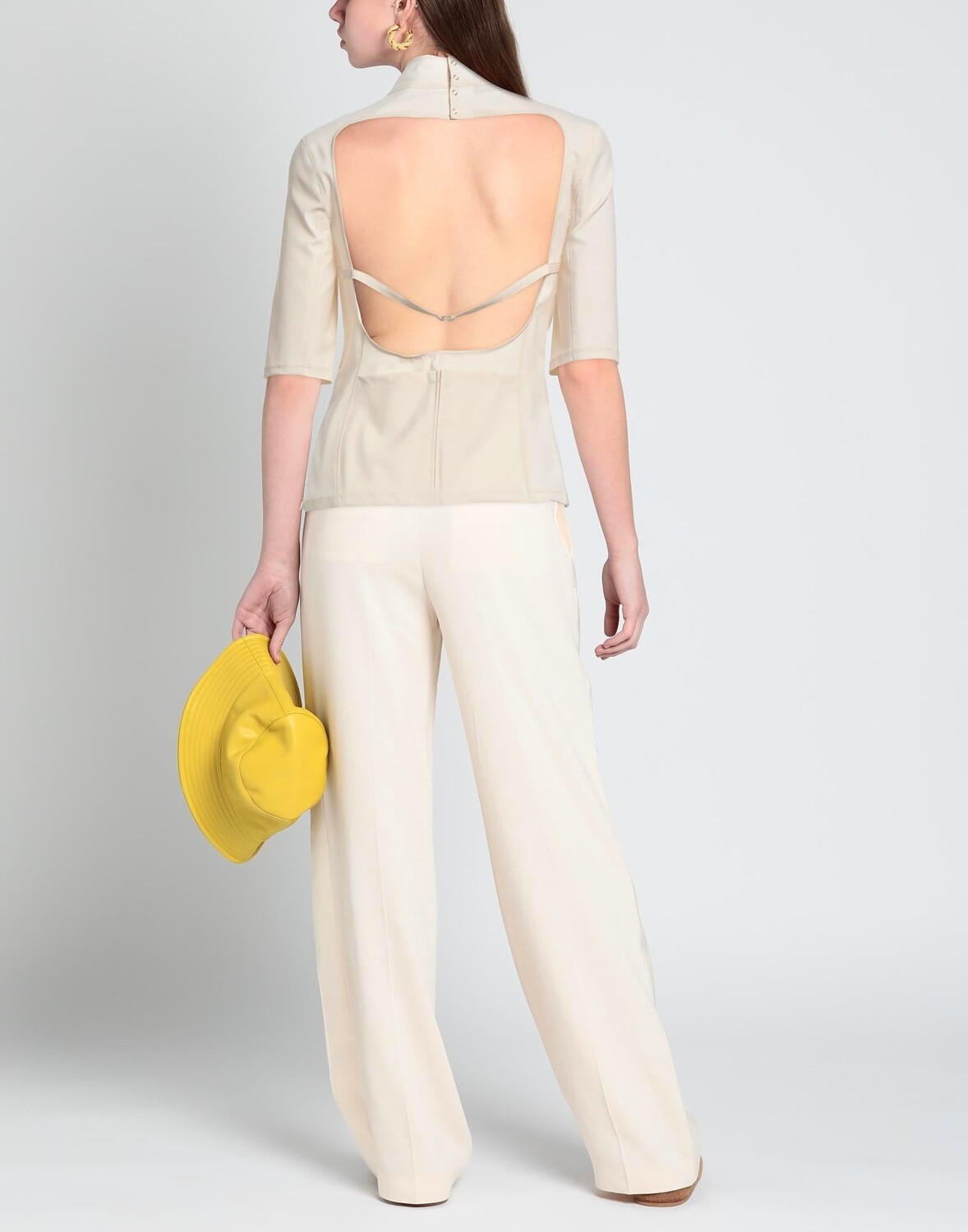 Женская светло-бежевая футболка Jacquemus из смесовой шерсти с эффектными вырезами спереди и открытой спиной.