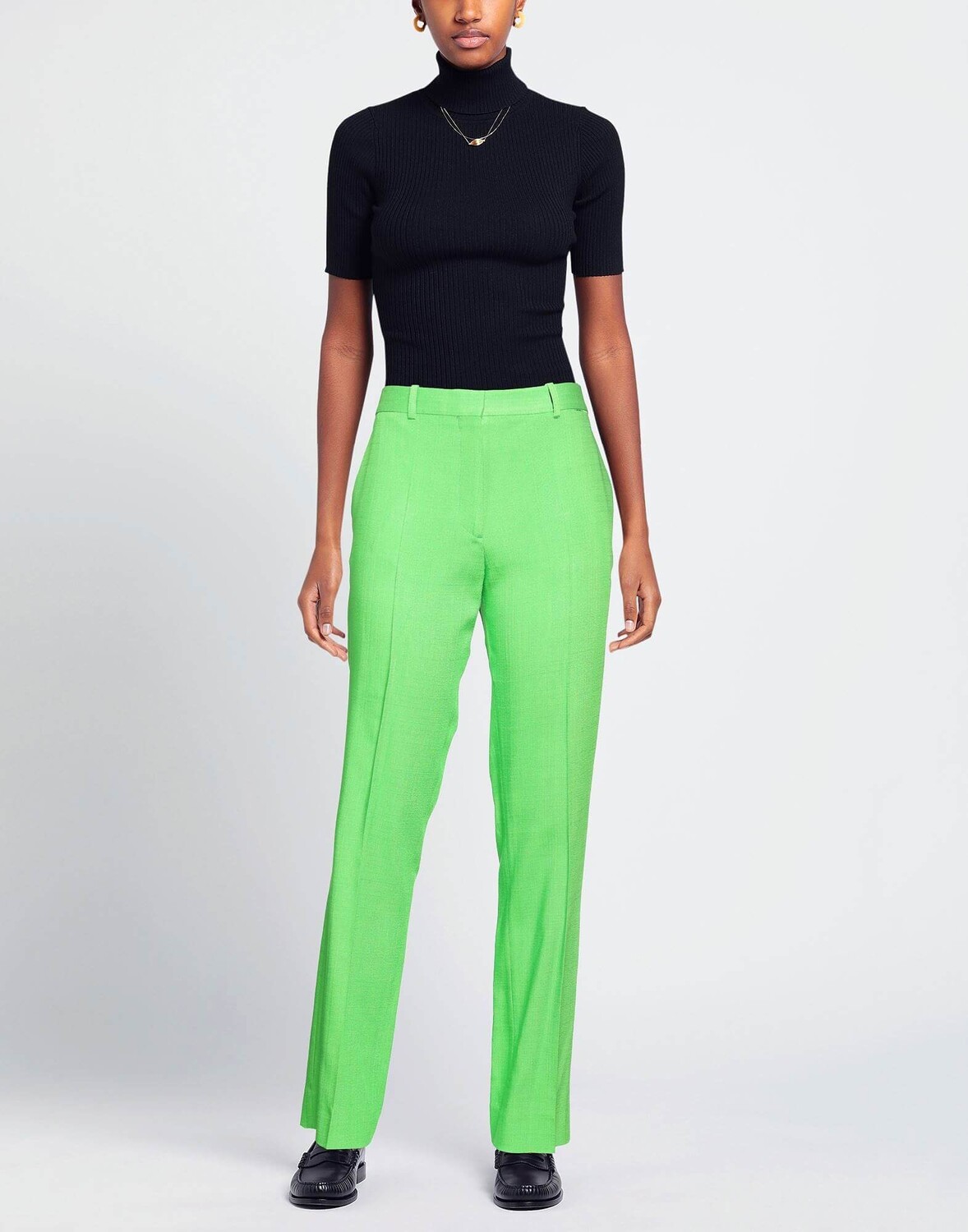 Брюки из легкой ткани, обычного прямого кроя, с прямыми штанинами, с высокой линией талии, застежкой на крючок и молнию, поясом со шлевками для ремня, задними прорезными карманами с пуговицами.