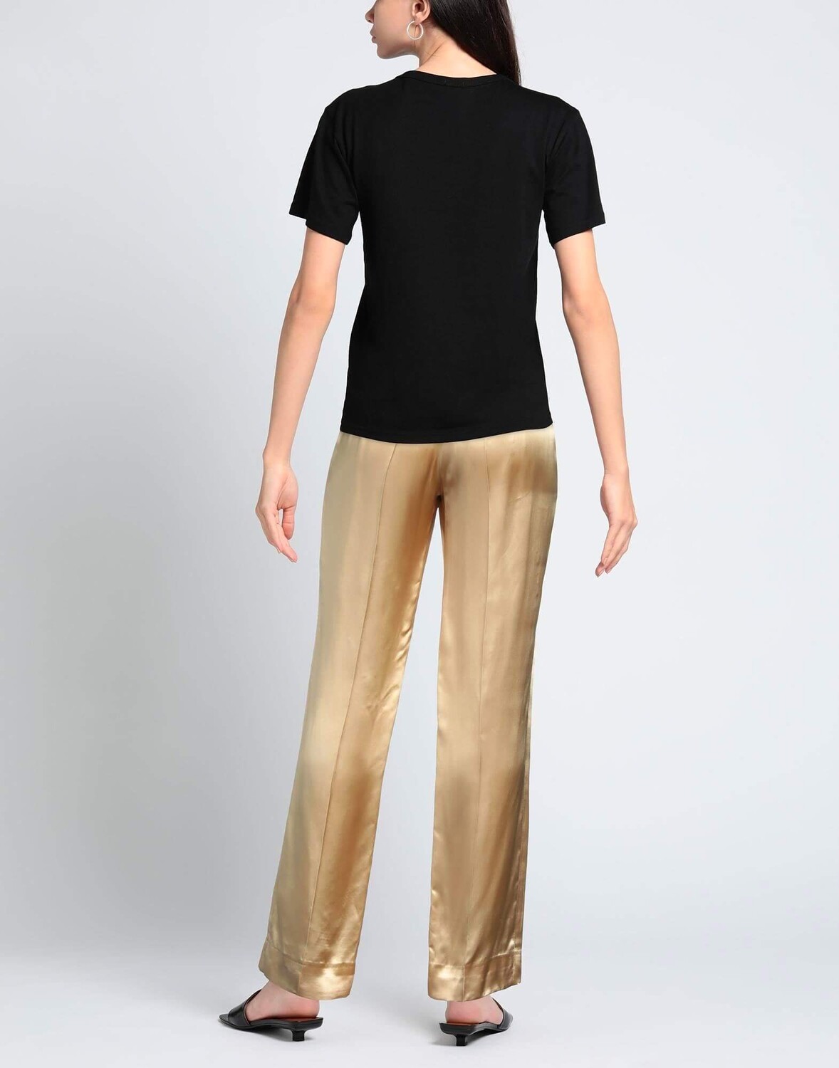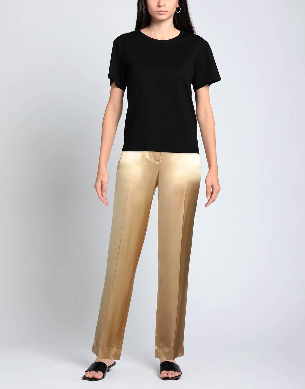Брюки из легкой блестящей ткани, обычного прямого кроя, с прямыми штанинами, с высокой линией талии, застежкой на крючок и молнию, боковыми карманами.